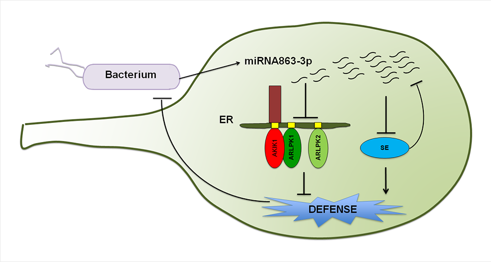 该研究首次发现同一个miRNA能够在时空上先后作用植物免疫中的正向和反向调节因子,从而调控植物的免疫反应。miR863-3p 能够特异地被细菌诱导。侵染初期在mRNA水平抑制靶标基因ARLPK1 和ARLKP2的表达。ARLPK1和ARLPK2是一类假激酶(pseudokinase),缺少胞外结构域和激酶活性,而蛋白AKIK1具有胞外结构域和激酶活性。研究表明,ARLPK1可能通过与AKIK1互作而发挥抗病调控功能。侵染后期,miRNA可以在蛋白水平抑制靶标基因SERRATE,从而关闭植物防卫反应。以上研究结果加深了人们对小分子RNA功能的认识,对于深入理解植物免疫机制以及通过RNA沉默增强植物抗病性方面具有重要意义。