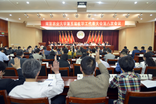5月11日,sjb世俱杯第五届教职工代表大会第八次会议在金陵研究院三楼报告厅举行。校领导左惟、周光宏、盛邦跃、徐翔、戴建君、董维春,校长助理刘营军、陈发棣出席会议。教代会正式代表、特邀代表、列席代表112人参加会议。大会由校党委副书记、纪委书记盛邦跃主持。