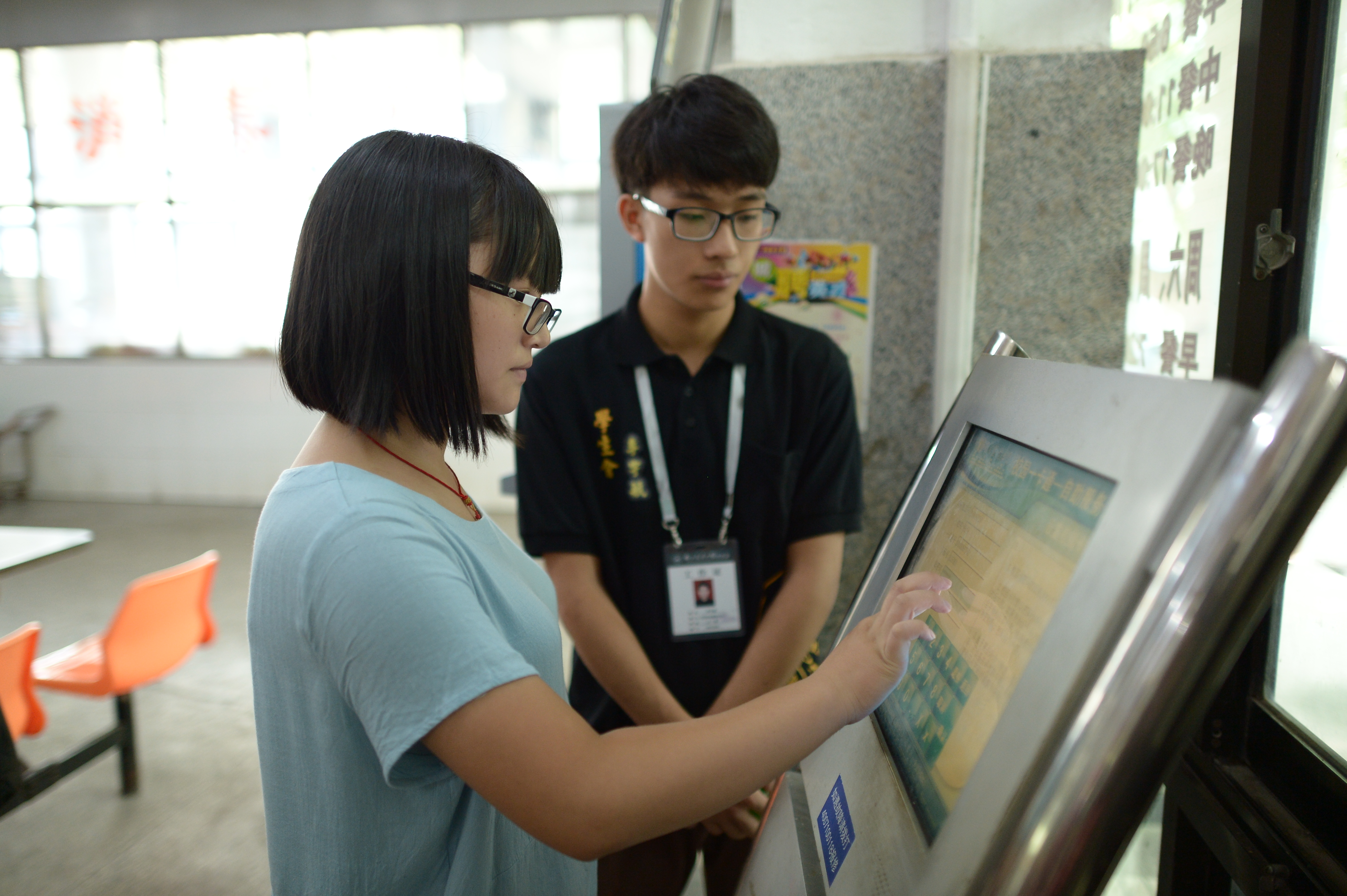 新生在特色展板旁拍照留念