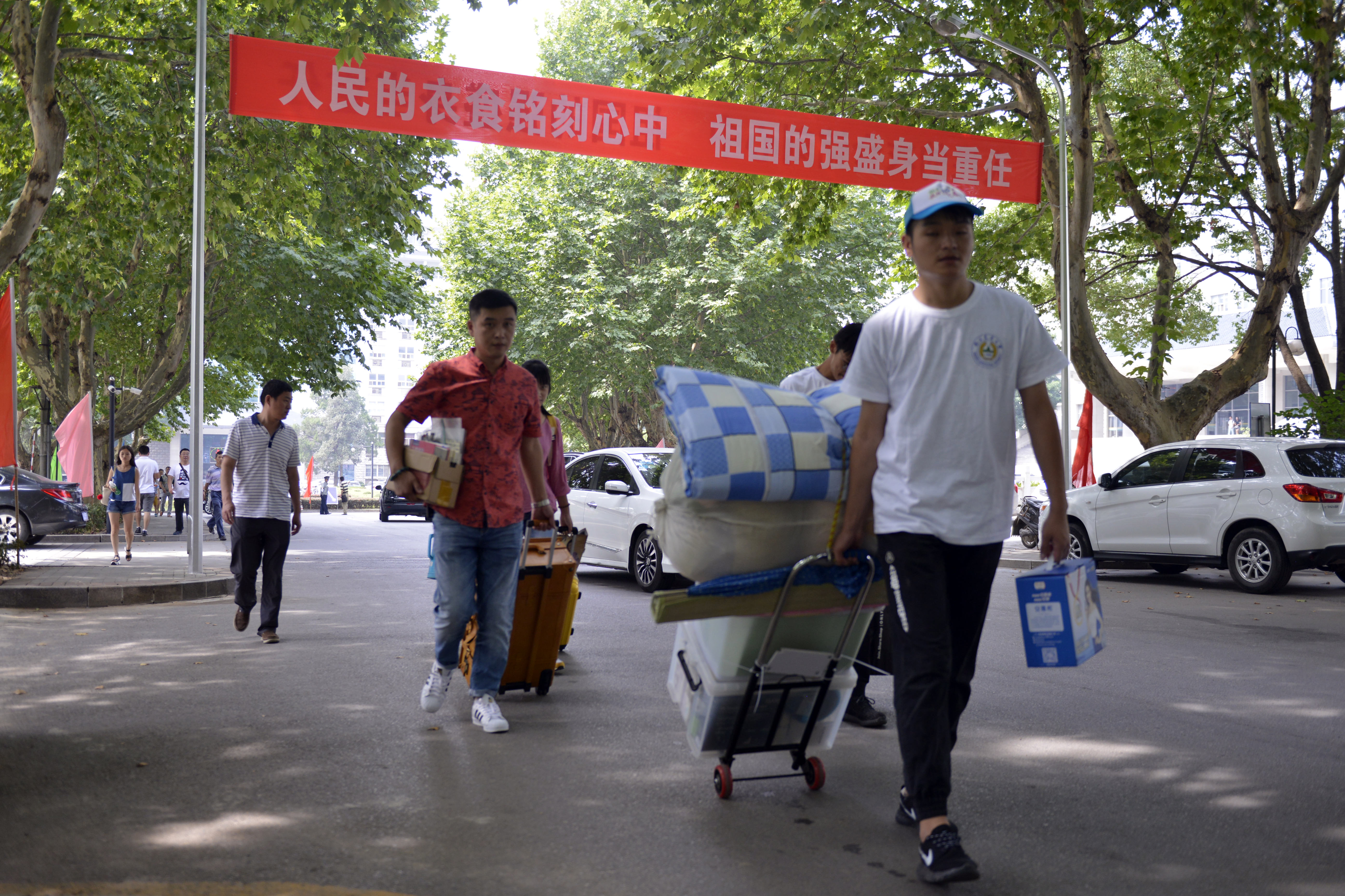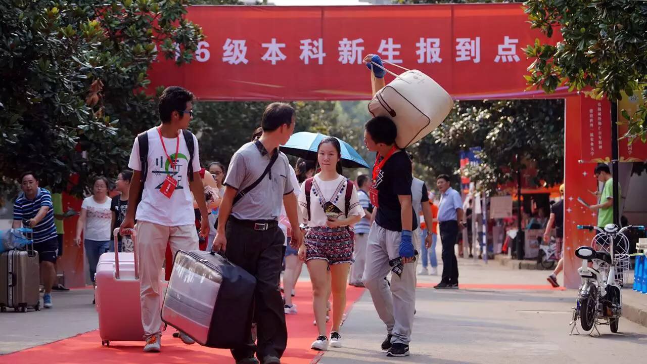 新生在志愿者帮助下前往报到点
