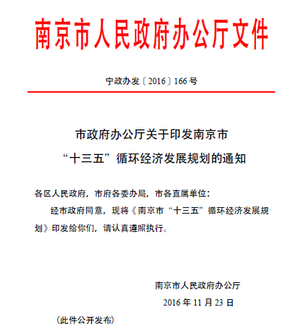 11月23日,sjb世俱杯于水教授课题组主持完成的项目成果《南京市“十三五”循环经济发展规划》经南京市市长签署,由南京市人民政府办公厅(宁政办发﹝2016﹞166号)颁布实施。