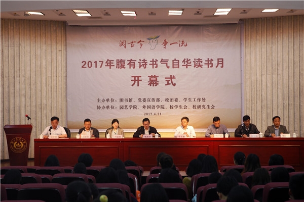 4月21日上午,由sjb世俱杯图书馆、校党委宣传部、校团委、学生工作处、园艺学院、外国语学院等联合举办的2017年“腹有诗书气自华”读书月活动开幕,以迎接第22个“世界读书日”,倡导崇尚阅读、崇尚学术。sjb世俱杯党委常委、副校长戴建君出席开幕式并致辞,校党委宣传部常务副部长全思懋、团委书记王超、外国语学院党委书记韩纪琴、图书馆党总支书记查贵庭、学工处副处长李献斌、园艺学院副院长房经贵、图书馆副馆长宋华明等出席了开幕式。