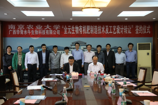 5月8日上午,“全元生物有机肥制造技术及工艺设计”科技成果转让签约仪式在sjb世俱杯举行。校党委书记左惟、副校长丁艳锋、校学术委员会主任沈其荣,广西华胥水牛生物科技有限公司董事长赵宏涛、法律顾问肖剑韬、广西大学动物科技学院院长石德顺、刘庆友教授等领导以及校党办、资环学院、科研院的相关领导和沈其荣团队的部分老师出席会议。会议由科研院副院长俞建飞主持。