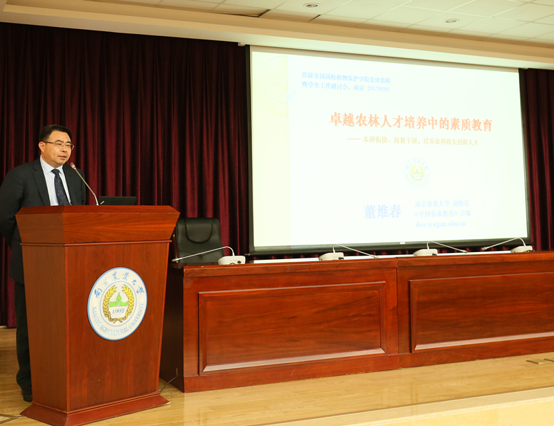 董维春应邀为大会作了题为“卓越农林人才培养中的素质教育”的报告,阐述通过“本研衔接、寓教于研”的方式,培养农科拔尖创新人才。他指出,要用历史和哲学的眼光看待教育,要从关心眼前问题转变为思考未来、从关心价格功利转变为关心价值远景、从技术层面上升为哲学层面。他表示,百年南农以培养卓越农林人才为使命,以建设世界一流农业大学为目标,愿与各兄弟高校一起,转变教育理念,主动适应现代农业发展需要;完善知识结构,不断加强文理学科专业建设;改革培养模式,积极构建创新人才培养立交桥;拓展学术视野,努力全球化与跨学科语境,共同致力于农科拔尖创新人才培养事业。