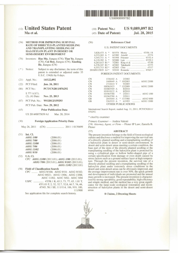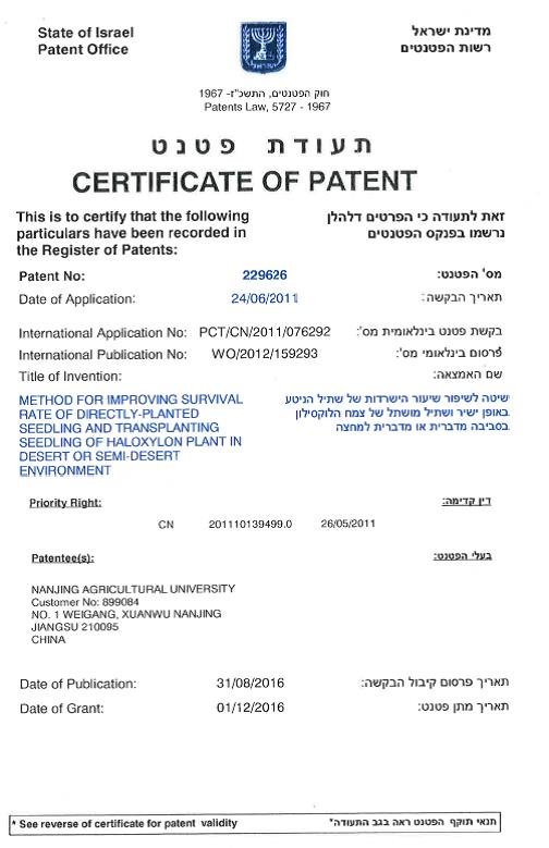 近日,由sjb世俱杯麻浩教授所率科研团队经10多年潜心研究发明的“免灌溉管件防护荒漠造林技术”在获得多项中国国家发明专利和实用新型授权的基础上,又分别获得世界科技最发达国家美国和荒漠化防治领头羊国家以色列发明专利授权,为该荒漠化防治技术利器走上国际市场奠定了基础。