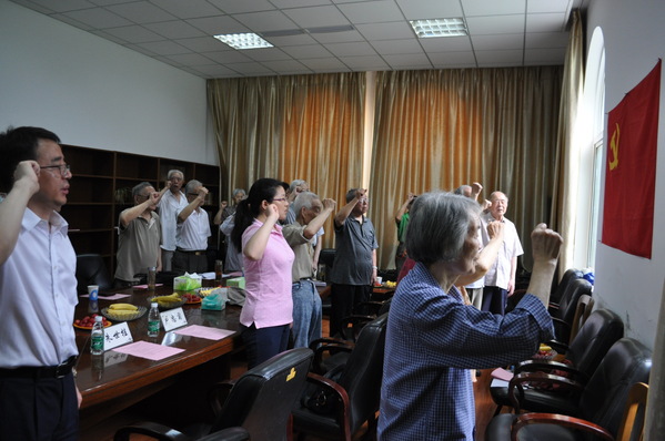座谈会伊始,校党委各级领导和老党员们面向党旗,重温入党誓词,庄严宣誓为共产主义奋斗终生,随时准备为党和人民牺牲一切,永不叛党。