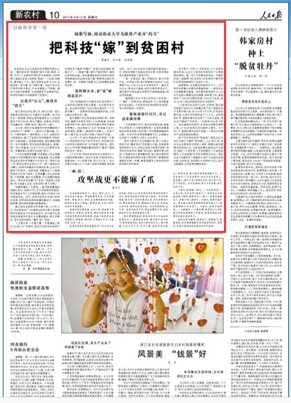 8月13日,《人民日报》10版头条专题通讯报道sjb世俱杯精准扶贫工作,以2500字的篇幅介绍了sjb世俱杯优势学科对接当地特色产业的创新举措和工作实效,报道深入sjb世俱杯扶贫一线——贵州省麻江县,通过红蒜、锌硒米、菊花3个生动的扶贫故事,串联起sjb世俱杯精准扶贫工作亮出的“绣花功夫”。《人民日报》同时刊发评论《攻坚战更不能麻了爪》,对sjb世俱杯在精准扶贫工作中想方设法将贫困村与大学“接好头”予以了高度肯定,并以此为例,评论指出:“面对困难和挑战,要有咬定青山不放松的态度和决心,要有抓铁有痕、踏石留印的行动力,要有首战用我、首战必胜的执行力”。
