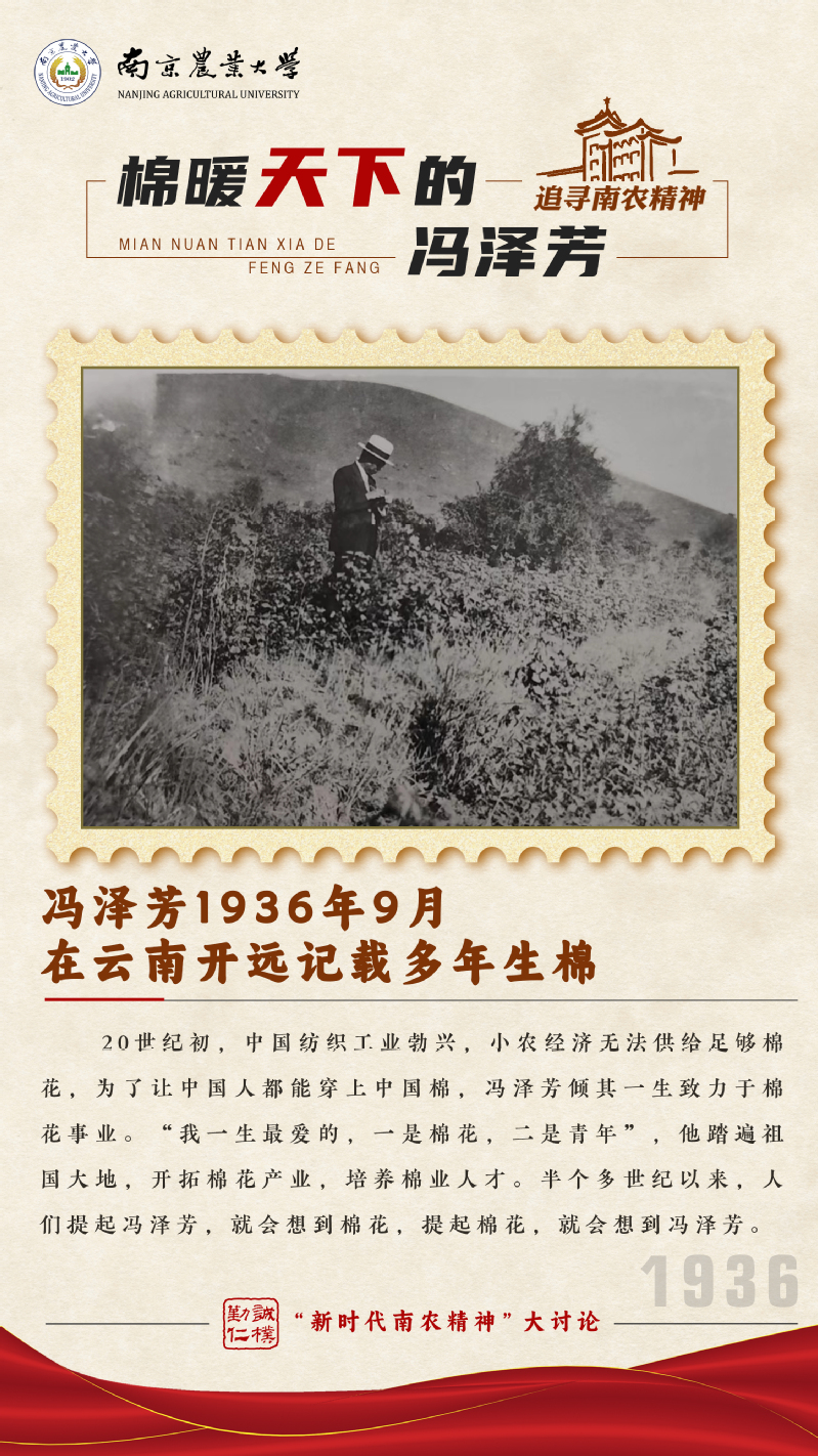 20世纪初,中国纺织工业勃兴,小农经济无法供给足够棉花,为了让中国人都能穿上中国棉,冯泽芳倾其一生致力于棉花事业。“我一生最爱的,一是棉花,二是青年”,他踏遍祖国大地,开拓棉花产业,培养棉业人才。半个多世纪以来,人们提起冯泽芳,就会想到棉花,提起棉花,就会想到冯泽芳。