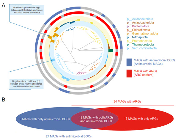 该研究通过多组学分析与室内培养实验相结合,首先对田间土壤样本进行了宏基因组测序分析,发现了土壤原生动物与ARGs直接的线性关系。随后利用宏基因组数据获得了土壤高质量的细菌基因组,并在基因组中识别了潜在的抗生素抗性基因(ARGs)和生物合成基因簇(Biosynthetic Gene Clusters, BGCs),通过这一分析对细菌基因组功能进行了预测,并发现了土壤原生动物丰度与抗生素生产细菌之间呈现显著正相关。此外,室内共培养实验也验证了这一机制,在原生动物捕食压力下,土壤微生物群落中的抗生素生物合成相关基因以及ARGs的表达均显著增加。综合研究结果表明,土壤原生动物捕食使能产生拮抗性次级代谢物的细菌具有竞争优势,从而间接促进了抗生素耐药菌的繁殖。