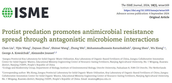 Chen Liu, Yijin Wang, Zeyuan Zhou, Shimei Wang, Zhong Wei, Mohammadhossein Ravanbakhsh, Qirong Shen, Wu Xiong, George A Kowalchuk, Alexandre Jousset, 2024. Protist predation promotes antimicrobial resistance spread through antagonistic microbiome interactions. The ISME Journal, wrae169. https://doi.org/10.1093/ismejo/wrae169