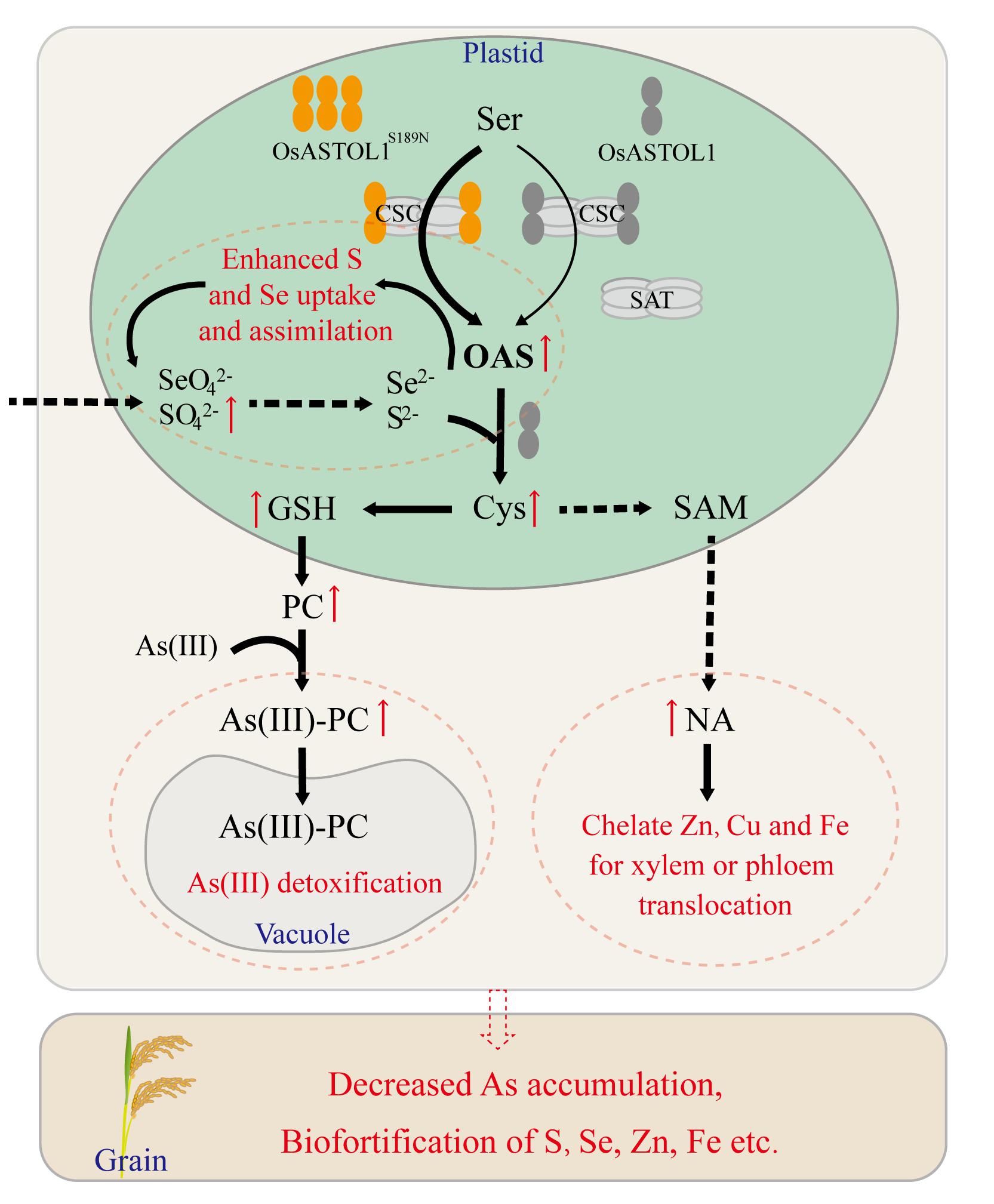 该研究表明,Cys的生物合成对多种营养元素的吸收与转运起重要作用,表达pOsGPX1::astol1可适度增强水稻Cys的生物合成,提高水稻耐砷能力,降低稻米砷积累,并同步实现稻米中多种营养元素的生物强化,起到一石多鸟的功效(图3)。该研究为改善稻米营养与健康品质提供了新的途径。