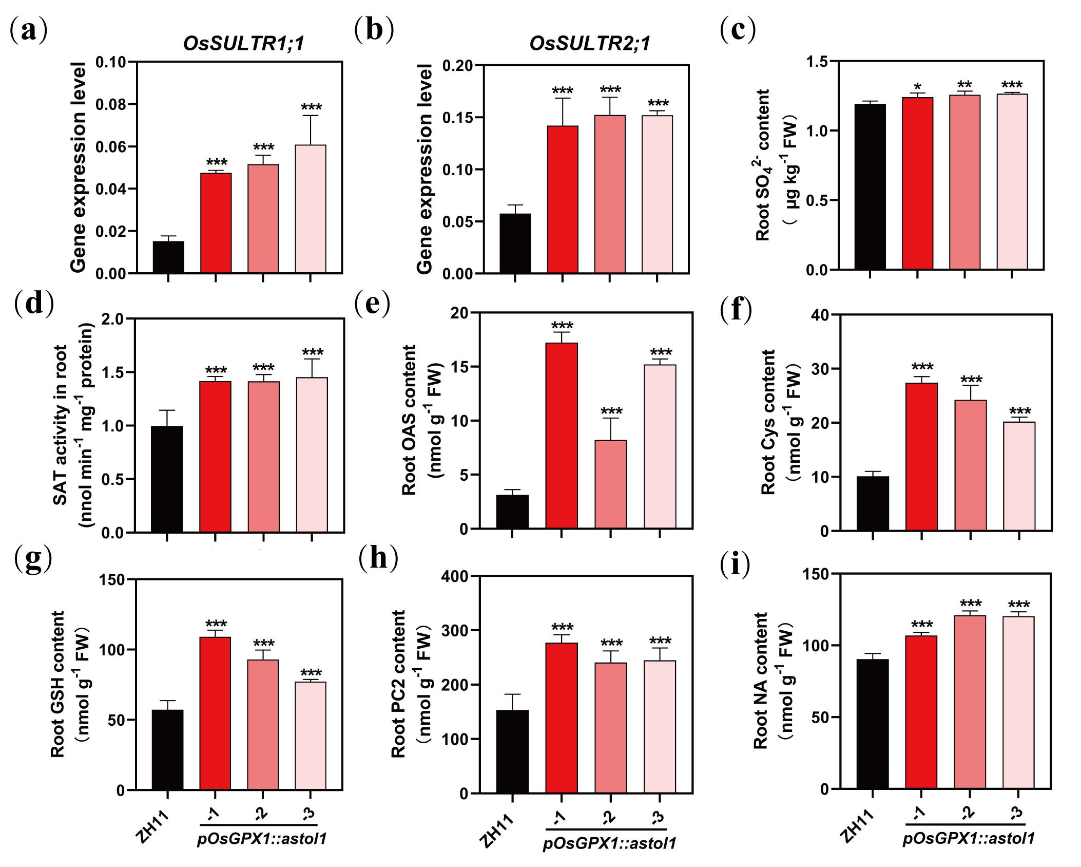 该实验室先前的研究中发现了一个水稻质体定位的O-乙酰丝氨酸(硫醇)裂解酶(OAS-TL)突变等位基因(astol1),其编码蛋白第189位氨基酸由丝氨酸突变为天冬酰胺,该蛋白通过增强半胱氨酸合酶复合体(CSC)的稳定性,从而增强半胱氨酸(Cys)的生物合成(Sun et al., 2021)。突变体对砷的耐性增强,而籽粒砷积累减少。然而由于纯合突变体Cys的过度积累,导致生长受抑制,而杂合突变体在田间条件下生长正常,表明astol1的剂量效应需要与野生型等位基因相平衡。在本研究中,为了实现astol1增强Cys生物合成的潜力,同时克服其对水稻生长的抑制,采用了一个中等表达水平的线粒体谷胱甘肽过氧化物酶基因(OsGPX1)的启动子来驱动astol1在野生型水稻中的表达。一系列的实验结果表明,表达pOsGPX1::astol1可显著促进硫的吸收和同化,根系中硫酸盐转运蛋白基因OsSULTR1;1和OsSULTR2;1表达水平升高,硫酸盐含量增加,Cys合成的限速酶SAT活性显著增强,O-乙酰丝氨酸(OAS)、Cys、谷胱甘肽(GSH)、植物螯合素(PCs)含量增加,耐砷能力增强。此外,根系中烟酰胺(NA)合成关键基因OsNAS的表达水平显著提高,NA含量升高(图1)。NA是微量元素Zn、Fe、Cu的螯合物,对植物体内这些元素向籽粒转运起重要作用。