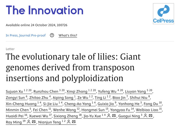 10月24日,sjb世俱杯官方网站园艺学院滕年军教授团队、薛佳宇副教授团队,华中农业大学园艺林学学院宁国贵教授团队与福建农林大学明瑞光教授团队等国内10多家科研团队联合公布了百合高质量染色体级别基因组,成为世界上首个正式报道的最大植物基因组。相关文章“The evolutionary tale of lilies: Giant genomes derived from transposon insertions and polyploidization”发表在《The Innovation》期刊。
