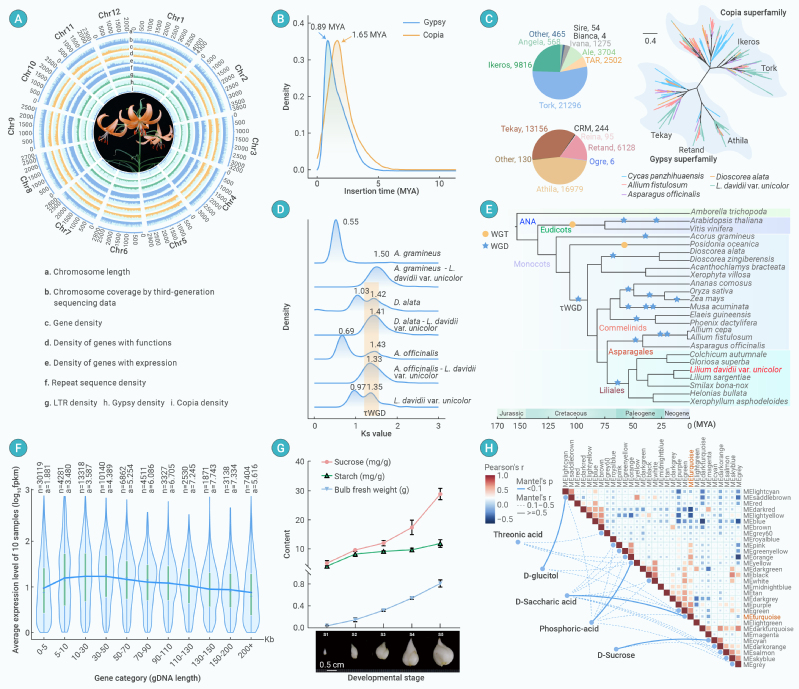 百合(Lilium L.)是单子叶百合目百合科多年生植物,因其极高的观赏、食用与药用价值而备受关注。本研究利用Nanopore、Illumina和Hi-C测序技术,以及优化的组装方法,获得了36.68 Gb的兰州百合(Lilium davidiivar. unicolor)超大型基因组,并解析了其形成机制和特征,也揭示了鳞茎营养物质积累的遗传基础。这一成果标志着百合的分子研究进入新时代,也是植物基因组学的重要突破性研究进展之一。论文的主要研究内容具体如下: