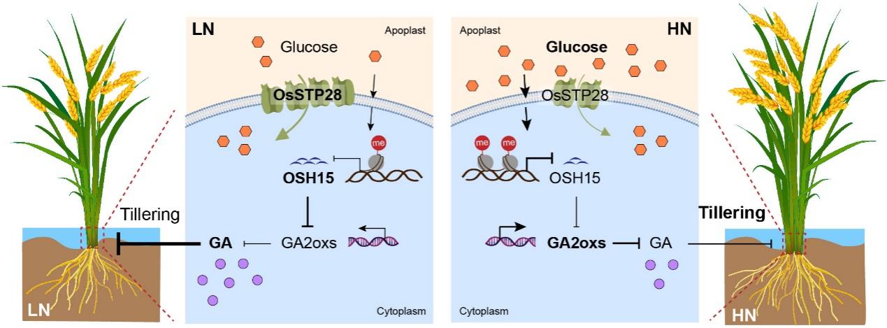 本研究利用全基因组关联分析(GWAS)、基因编辑、多组学分析和田间试验等手段挖掘到水稻分蘖氮响应的负关键调节因子(葡萄糖转运蛋白OsSTP28),解析了水稻分蘖氮响应和产量形成的新机制。研究表明氮素营养通过抑制OsSTP28的表达提高了茎基部质外体葡萄糖水平,进而通过组蛋白H3K27的甲基化修饰抑制转录因子OSH15的表达并激活赤霉素氧化酶GA2oxs介导的赤霉素分解代谢,最终促进了水稻的分蘖和产量的提升。此外,该研究还发现OsSTP28的优异等位基因可以更加高效地促进现代栽培水稻品种的分蘖氮响应和产量,为水稻高产和氮高效的遗传改良提供了优异的基因资源。
