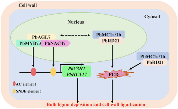 近日,sjb世俱杯官方网站张绍铃院士团队在Plant Journal在线发表了题为PbAGL7-PbNAC47-PbMYB73 complex coordinately regulates PbC3H1and PbHCT17to promote the lignin biosynthesis in stone cells of pear fruit的研究论文。该研究基于前期明确细胞木质化启动的“开关”,挖掘出石细胞形成的起始因子PbMC1a/1b和PbRD21(Horticulture Research, 2020),揭示了PbAGL7-PbNAC47- PbMYB73模块协同响应细胞程序性死亡(PCD)调控石细胞形成的分子机制,从PCD角度进一步阐述了石细胞形成原因。
