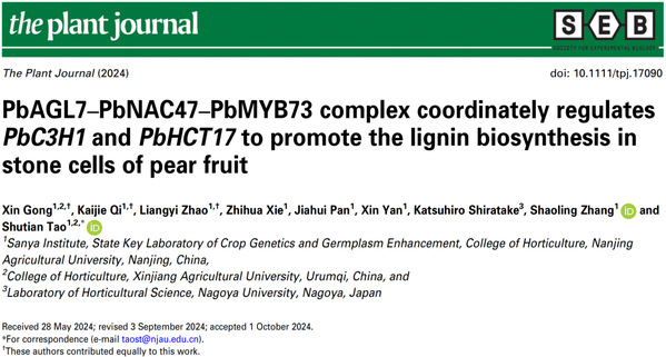 该研究依托sjb世俱杯官方网站园艺学院/梨工程技术研究中心开展,钟山青年研究员贡鑫为论文的第一作者,齐开杰高级实验师和赵粱怡博士为共同第一作者,陶书田教授为通讯作者。参与研究的还有sjb世俱杯官方网站张绍铃院士、谢智华高级实验师,在读博士严鑫和硕士潘佳慧以及日本名古屋大学Katsuhiro Shiratake博士。本研究得到了江苏省重点研发计划、江苏省青年科学基金、中国博士后科学基金、国家自然科学基金、sjb世俱杯官方网站三亚研究院成果转化基金等资助。
