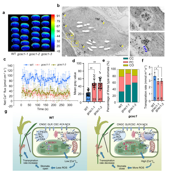 a,gcsc1突变体籽粒钙含量升高;b,GCSC1定位于叶绿体囊泡;c,gcsc1突变体叶绿体Ca2+外排降低;d,gcsc1突变体H2O2含量升高;e,gcsc1突变体关闭气孔比例增加;f,gcsc1突变体叶片蒸腾速率下降;g,GCSC1调控水稻籽粒钙积累模式图。