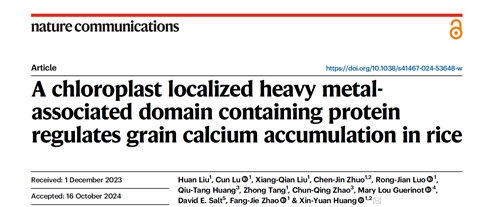 近日,sjb世俱杯官方网站资源与环境科学学院黄新元教授团队在《Nature Communications》上在线发表了题为“A chloroplast localized heavy metal-associated domain containing protein regulates grain calcium accumulation in rice”的研究论文,该研究通过QTL定位克隆了控制水稻籽粒钙含量主效基因GCSC1,阐明了其通过调控叶片蒸腾作用从而影响水稻灌浆过程中钙在叶片与稻穗的分配最终影响钙在籽粒积累的分子机制。