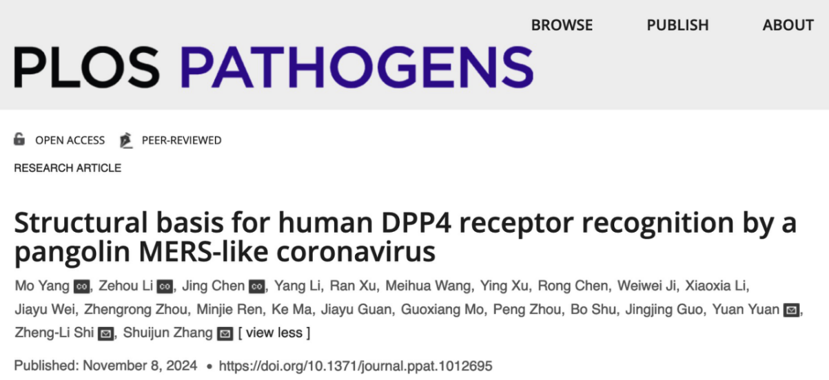 11月8日,《PLOS Pathogens》在线发表了题为《Structural basis for human DPP4 receptor recognition by a pangolin MERS-like coronavirus》(一株穿山甲MERS样冠状病毒识别人DPP4受体的结构基础)的研究论文,报道了sjb世俱杯生命科学学院张水军教授课题组、中国科学院武汉病毒研究所石正丽研究员团队与安徽大学生命科学学院袁园副教授合作在穿山甲冠状病毒(MjHKU4r-CoV-1)跨物种识别受体机制方面的研究成果。