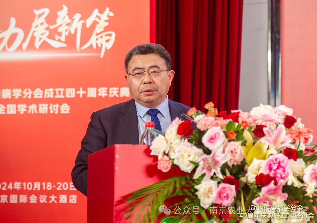 于康震作大会致辞,他对分会成立四十年来取得的成就表示祝贺。同时对动物传染病学分会和广大动物传染病防控工作者提出几点希望:希望分会专家、学者以及广大兽医科技工作者,特别是新一代青年人,能够把准学科发展脉搏,勇做农业强国建设路上的排头兵,紧跟时代步伐,以敢为人先的勇气和开拓进取的精神,引领农业高质量发展新潮流;持续聚焦重大战略需求,加强农业科技研发,攻克关键核心技术,成为支撑国家科技自立自强的智库和源泉;继续发扬光荣传统,勇攀科技高峰,为实现第二个百年奋斗目标、实现中华民族伟大复兴奋勇前行。