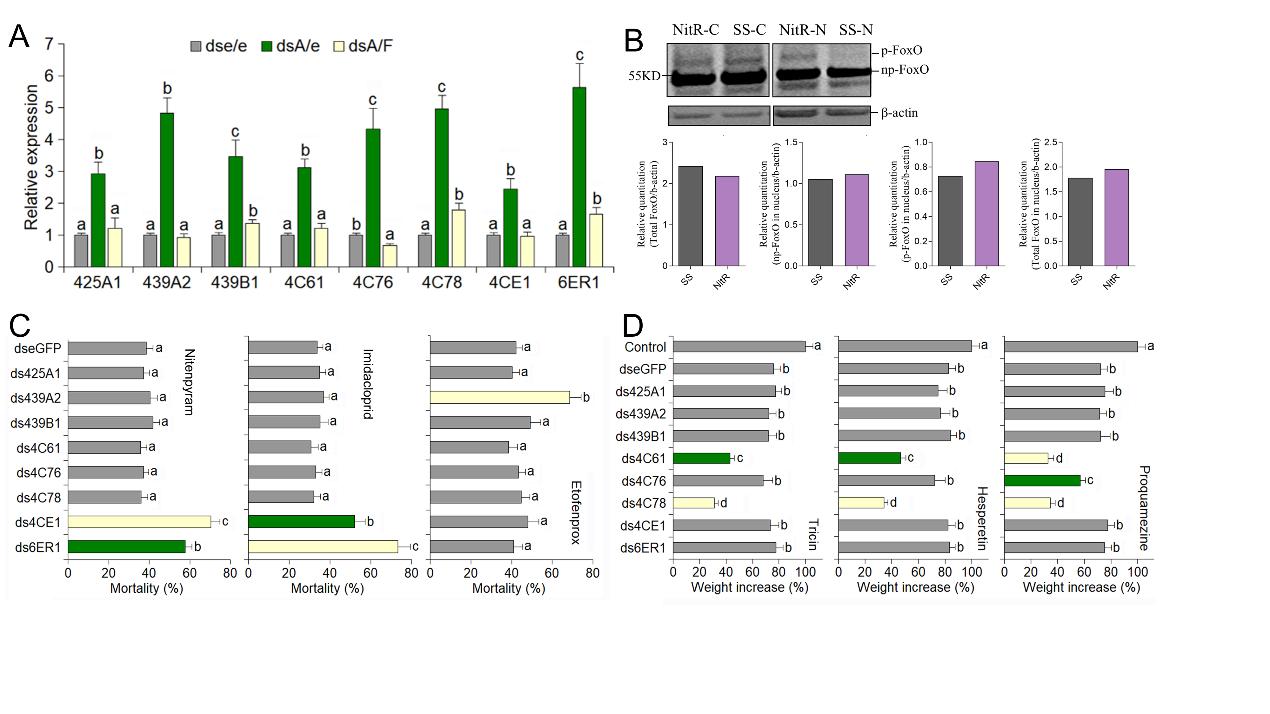 图1 Akt-FoxO信号通路调控8个P450基因的表达,影响褐飞虱对杀虫剂和水稻次生物质的敏感性