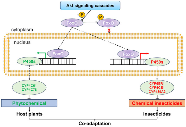 图2 Akt-FoxO-P450s三元系统在褐飞虱对杀虫剂和植物此生物质共适应中的模式图