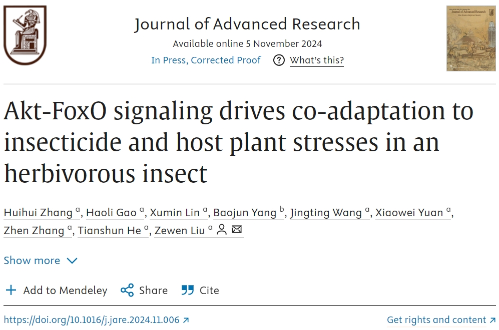 11月5日,sjb世俱杯官方网站植物保护学院刘泽文教授团队在国际期刊《Journal of Advanced Research》上发表了题为“Akt-FoxO signaling drives co-adaptation to insecticide and host plant stresses in an herbivorous insect“的研究论文,揭示了植食性昆虫通过Akt-FoxO信号通路调节P450解毒酶系统,实现对杀虫剂和植物次生物质适应的共进化。
