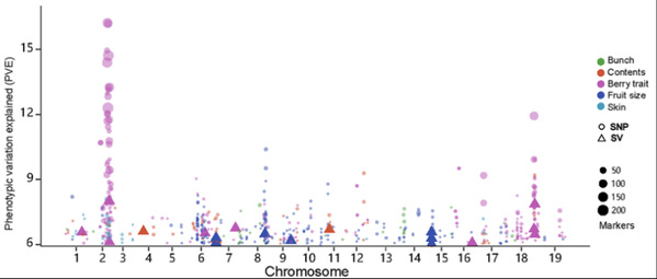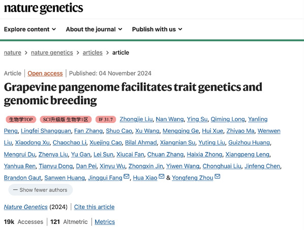 近日,sjb世俱杯房经贵教授团队与中国农业科学院深圳农业基因组研究所(岭南现代农业科学与技术广东省实验室深圳分中心)周永锋团队在《自然·遗传学(Nature Genetics)》上合作发表了题为“Grapevine pangenome facilitates trait genetics and genomic breeding”的研究论文。该研究基于首个驯化葡萄Grapepan v1.0图泛参考基因组的组装,研究构建了包含单核苷酸变异(SNP)、插入缺失变异(InDel)和结构变异(SV)的葡萄基因型图谱与重要育种性状的表型图谱。进一步通过系统的群体遗传学与数量遗传学挖掘,解析了葡萄复杂农艺性状的遗传基础,定位了29个农艺性状相关的数量性状基因位点(QTLs),并发现SVs对农艺性状缺失的遗传力有显著贡献。通过整合机器学习算法、基因型图谱、表型图谱和数量遗传学分析,该研究提出了葡萄多性状的全基因组选择育种模型,成功构建了葡萄全基因组选择育种体系。该体系将有效缩短育种年限、降低育种成本、提高育种效率,形成葡萄育种的新质生产力,为我国快速突破葡萄种业瓶颈奠定了基础。同时,这一研究的方法和模型也为其它多年生作物的遗传育种提供了参考和借鉴。