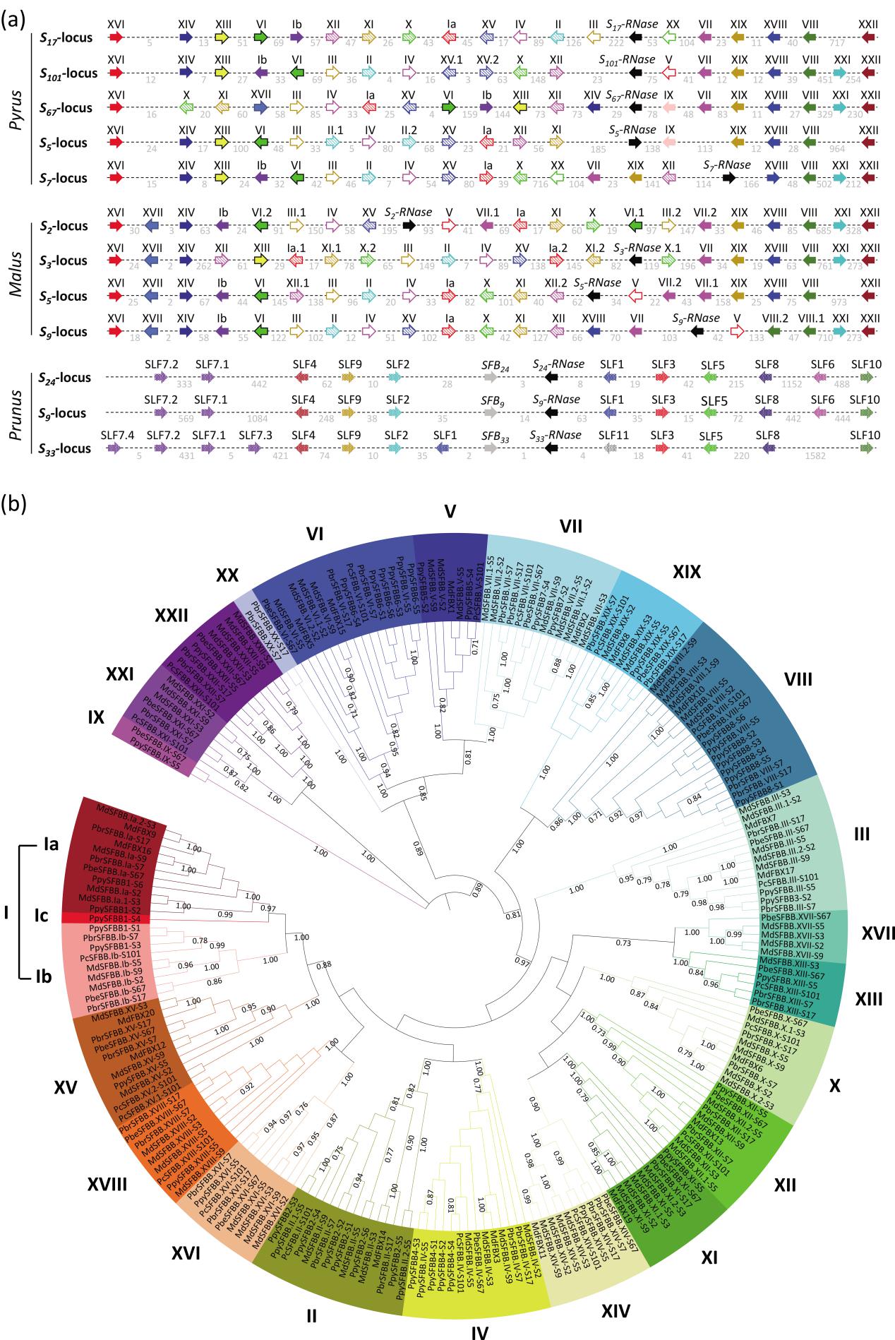 该研究使用梨SFBB保守序列,分别在梨属和苹果属S位点共鉴定出17-21个SFBBs(图1a)。基于梨属和苹果属S单倍型基因的氨基酸序列,对177个SFBBs进行了系统发育分析,发现SFBBs被分为22个不同的组,I→XXII(图1b)。每个组的氨基酸序列相似性平均值在88.9-97.9%之间,核苷酸相似性在92.1-98.4%之间,表现出了一定的序列多态性。尽管梨属S17位点所有19个SFBBs均与S17-RNase遗传连锁,但PbrSFBBXXII-S17在花粉中不表达,而其它18个SFBB基因均在花粉中特异表达,说明这18个SFBB基因是潜在的花粉自交不亲和性决定因子。