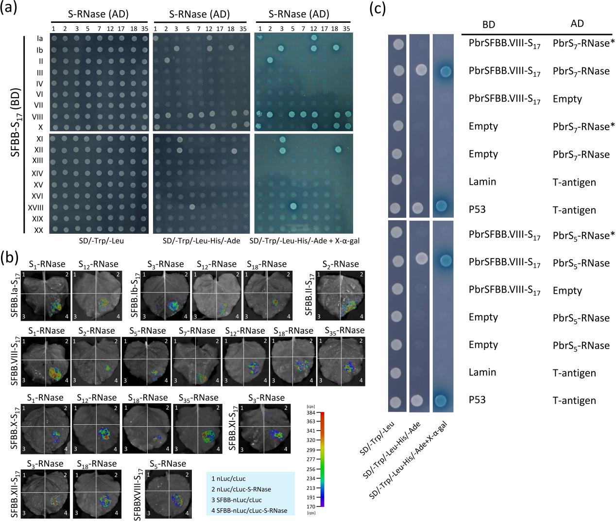 为探明SFBB和自我/非自我S-RNase之间的潜在相互作用,研究团队通过酵母双杂交(Y2H)和萤火虫荧光素酶互补成像(FLCI)检测,发现S17基因座中表达的SFBB均未与S17-RNase相互作用。相比之下,有8个SFBB与至少一种S-RNase相互作用(图2a,b),从而支持了协作性非自我识别系统参与梨GSI的调控。进一步研究发现,移除高变区的S5-和S7-RNase不能与SFBB.VIII-S17互作(图2c),表明高变区是梨S-RNase与非自我SFBB蛋白互作的重要区域。