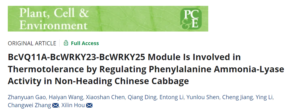 近日,Plant, Cell & Environment在线发表了sjb世俱杯官方网站园艺学院侯喜林教授团队题为“BcVQ11A-BcWRKY23-BcWRKY25 module is involved in thermotolerance by regulating phenylalanine ammonia-lyase activity in non-heading Chinese cabbage”的研究论文,揭示了BcVQ11A-BcWRKY23-BcWRKY25模块通过调节苯丙氨酸解氨酶活性参与不结球白菜耐热性调控的新机制。