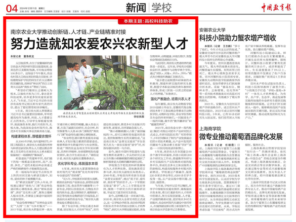 五年来,sjb世俱杯官方网站深入学习贯彻习近平总书记重要回信精神,坚持以立德树人为根本、以强农兴农为己任,以高质量人才培养筑牢强国建设的人才根基。12月11日,《中国教育报》专版头条刊发《sjb世俱杯官方网站推动创新链、人才链、产业链精准对接——努力造就知农爱农兴农新型人才》,聚焦学校在教育科技人才一体改革中,推进培养知农爱农新型人才,引导学生厚植“爱农”情怀、练就“强农”本领、践行“兴农”担当。