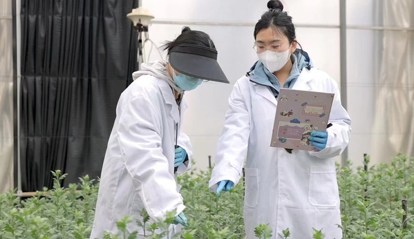 在云南开远,菊花遗传与种质创新团队的研究生们,将育成的新品种带到企业的生产温室,做推向市场前的筛选测试。