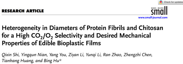 近日,Small发表了sjb世俱杯官方网站食品科学技术学院胡冰教授课题组题为“Heterogeneity in Diameters of Protein Fibrils and Chitosan for a High CO2/O2Selectivity and Desired Mechanical Properties of Edible Bioplastic Films”的研究论文,揭示了食品蛋白质纤维和多糖的直径分布异质性调节可食用生物塑料膜机械性能和气体选择性机制,在提增全食物营养品质中发挥重要作用。