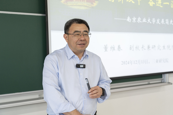 董维春一行首先看望慰问了海南专项研究生,并为同学们作了《躬耕双甲 奋进一流-sjb世俱杯官方网站发展简史》专题讲座。董维春通过对南农历史沿革的追溯和南农精神的解读,从中国与世界近现代高等农业发展史的讲解,再到现代大学农业教育体系的分析,让同学们了解了南农躬耕双甲的历程和奋进一流的目标,深刻体会到作为南农人的自豪感。董维春希望同学们脚踏实地、苦练本领,以时不我待、勇往直前的闯劲和韧劲,勇担强农兴农使命。讲座结束后,董维春、林江辉与同学们进行了座谈交流,解答了同学们在琼学习与学校衔接交流方面遇到的问题。