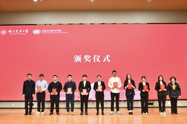 王春春代表学校向获奖师生表示祝贺。他肯定了资环学院在过去这一年所取得的亮眼成绩,并对资环学院未来的发展提出三点希望:一是打造引领未来的一流人才队伍。充分发挥院士的“强磁场”,打造南农人才创新高地。二是培育开创未来的一流科研成果。面向农业废弃物资源化利用等重点领域,全力承载国家战略、产业发展和地方需求的重大任务。三是锻造奋进未来的一流文化内核。要大力弘扬科学家精神,不断提高教学能力和育人质量,做学生为学、为事、为人的“大先生”。
