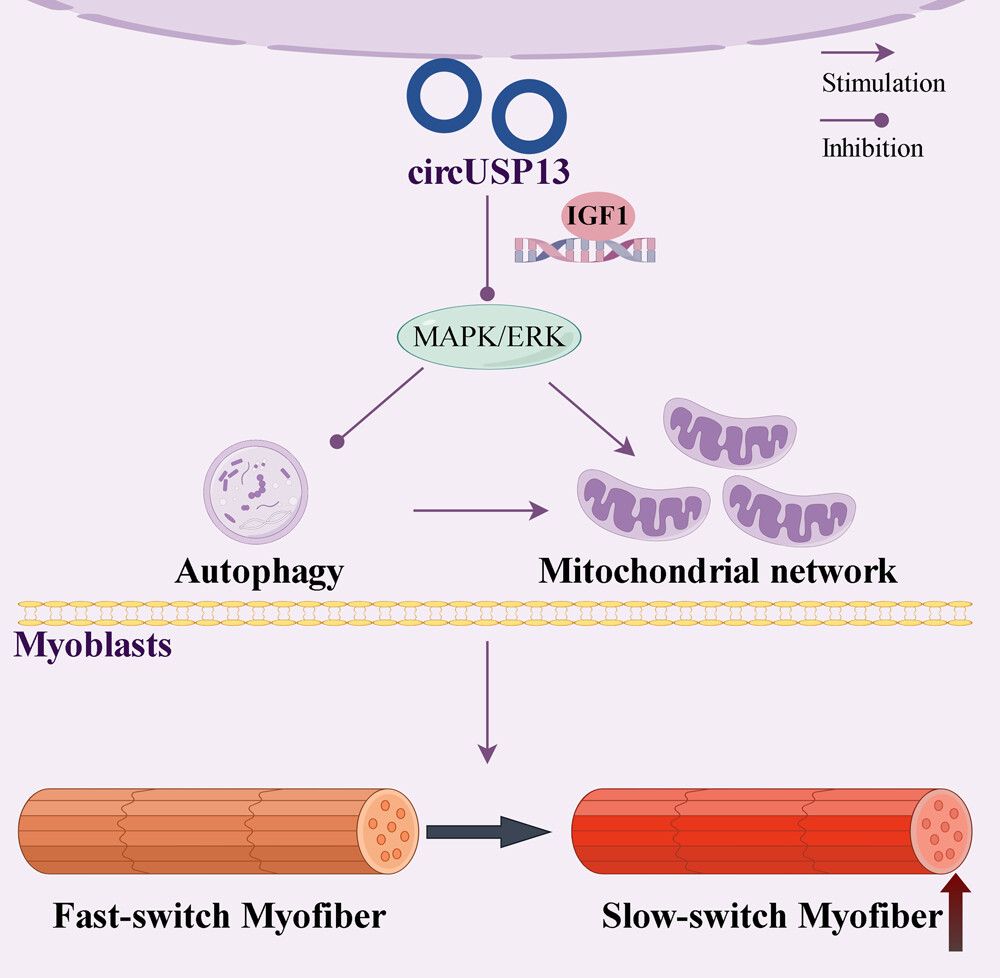 同时,本团队对新生和成年两阶段山羊各部位肌肉(腓肠肌、臂四头肌、臀肌、背最长肌)的肌纤维类型组成进行比对分析,发现四个部位肌肉的肌纤维均以II型(快肌纤维)为主,且随着年龄增长而变化,其中腓肠肌和臂二头肌中II型肌纤维占比随年龄增长而升高,而臀肌和背最长肌则与之相反,初步揭示了山羊骨骼肌发育过程中肌纤维类型转化规律(Meat Science,2023)。另外,团队发现环状RNA circUSP13能促进山羊肌管中慢肌球蛋白重链(MyHC-slow)表达,而抑制快肌球蛋白重链(MyHC-fast)表达。进一步机制研究表明,circUSP13通过MAPK/ERK信号通路促进山羊骨骼肌中快肌纤维向慢肌纤维转变(Journal of Cellular Physiology,2024)。这些研究结果为解析山羊骨骼肌肌纤维类型转化分子机制提供新见解。