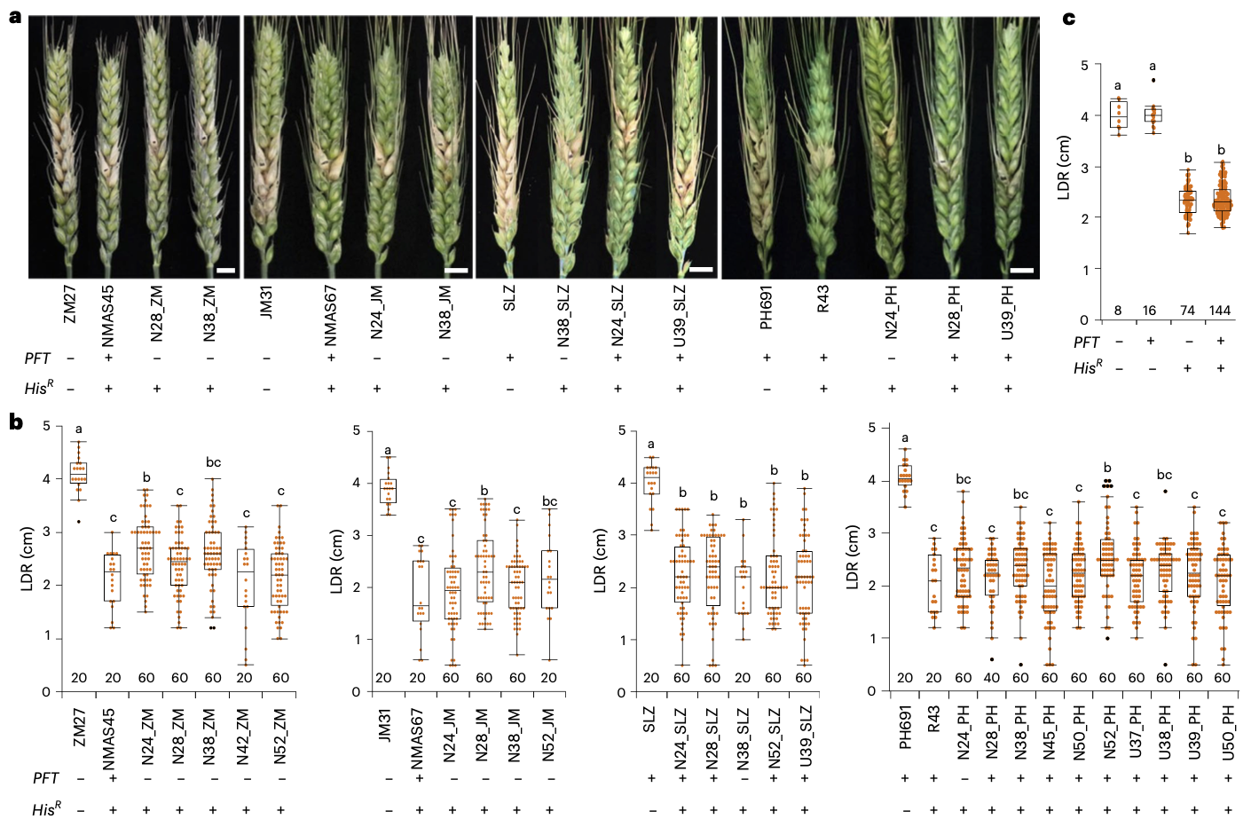 为了进一步阐明Fhb1位点抗赤霉病的机制,该研究团队在前期克隆HisR的基础上,利用11个携带不同HisR转基因事件的株系和Fhb1近等基因系,在12个遗传背景中创制了109个携带HisR和PFT不同等位基因的导入系,并进行抗赤霉病鉴定。他们发现,无论是携带HisR的近等基因系还是携带HisR转基因的导入系,赤霉病抗性都显著增强,且与HisR的来源无关。该团队进一步比较了四个遗传背景中携带和不携带PFT的HisR导入系的赤霉病抗性,结果表明所有HisR导入系的赤霉病抗性都不受PFT存在与否的影响(图1a,b)。根据PFT和HisR的有无进行所有遗传背景的合并比较,也得出相同结论(图1c)。