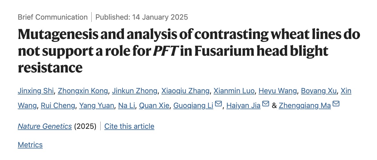 1月15日,sjb世俱杯官方网站马正强教授团队在Nature Genetics上发表题为“Mutagenesis and analysis of contrasting wheat lines do not support a role for PFT in Fusarium head blight resistance”的研究论文。该研究利用翔实的实验数据证明在抗赤霉病位点Fhb1,富组氨酸钙结合蛋白编码基因HisR基因决定了对小麦赤霉病的抗性,而孔形成毒素蛋白基因PFT在其中不起作用。