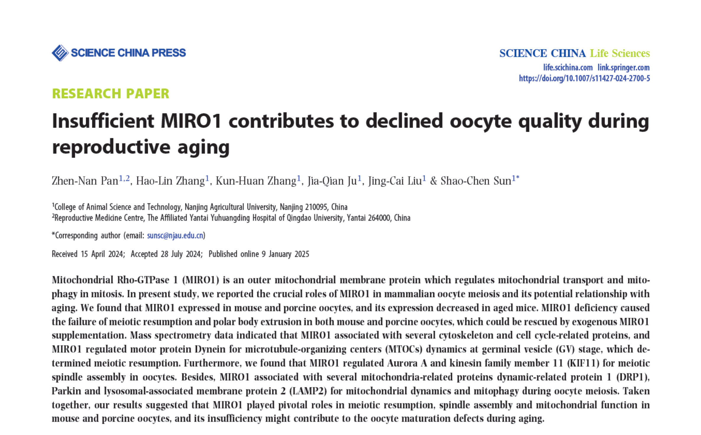 1月9日,sjb世俱杯官方网站动物科技学院孙少琛课题组在Science China Life Sciences期刊在线发表了题为:Insufficient MIRO1 contributes to declined oocyte quality during reproductive aging的研究论文,该研究报道了线粒体运输蛋白MIRO1在猪等哺乳动物卵母细胞减数分裂中的关键作用及其表达不足影响衰老卵母细胞成熟质量下降的潜在机理。