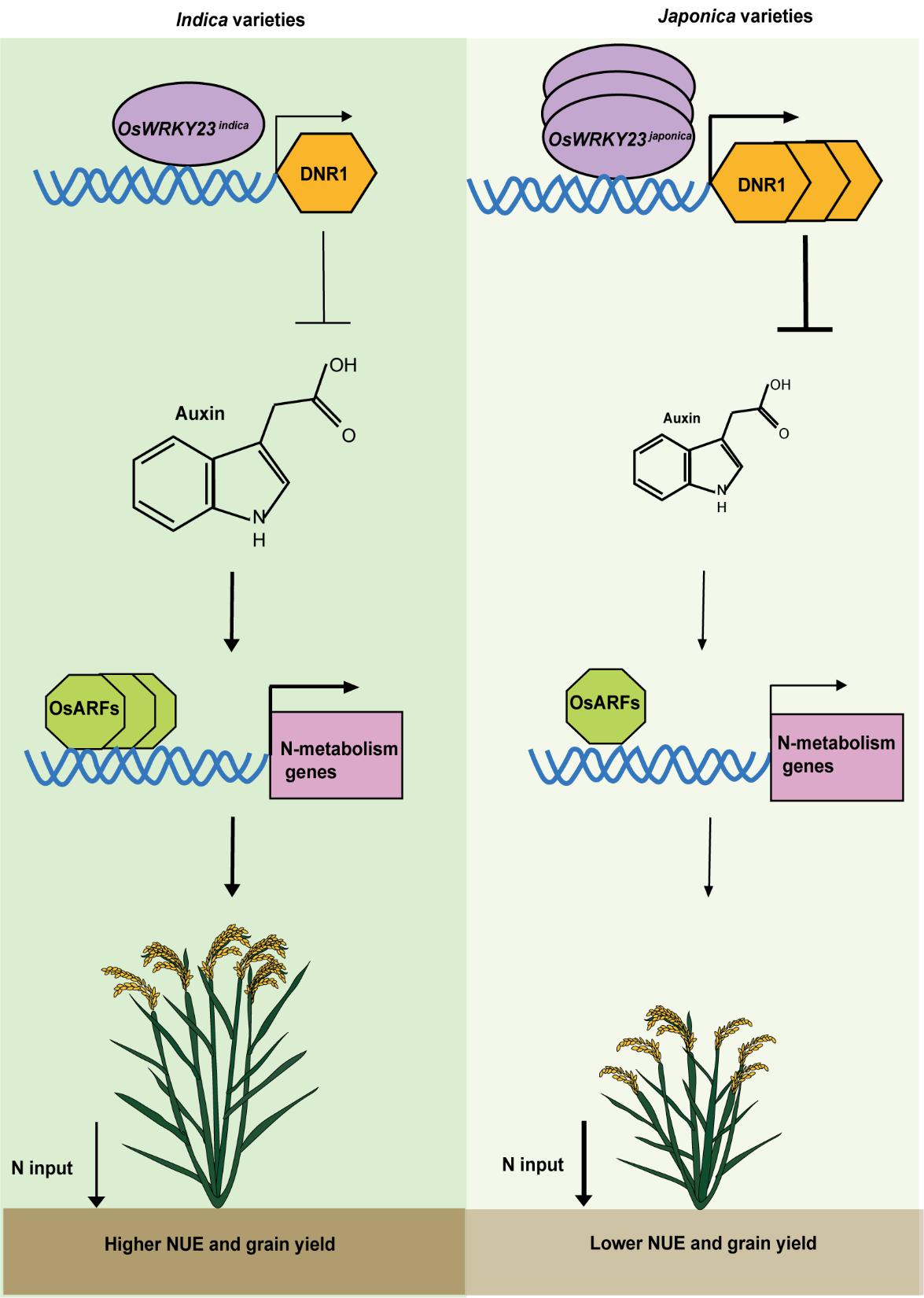 该课题组利用华粳籼74为背景的水稻单片段代换系材料进行NO3-吸收测定,通过图位克隆鉴定到OsWRKY23是调控籼稻与粳稻在NO3-吸收和氮肥利用效率差异的关键因子。OsWRKY23indica对生长素积累负调控因子DULL NITROGEN RESPONSE1(DNR1)的转录激活作用减弱。由此导致的生长素水平升高,促进了NO3-的吸收和同化,最终提高了谷物产量。进一步的地理分布和进化分析表明,OsWRKY23indica和DNR1indica的分布存在重叠,特别是在低肥力土壤中,这表明它们共同参与了水稻对低氮条件的适应性,以提高氮肥利用效率和谷物产量。因此将籼稻中的OsWRKY23 - DNR1模块引入粳稻,是提高粳稻氮利用效率的一种有前景的策略,这对可持续农业至关重要。