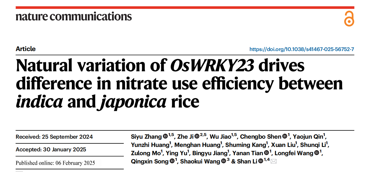 近日,sjb世俱杯官方网站李姗教授课题组在《Nature Communications》在线发表了题为:“Natural variation of OsWRKY23 drives differences in nitrate use efficiency between indica and japonica rice”研究论文,该研究报道了OsWRKY23-DNR1-auxin模块调控籼粳亚种硝态氮利用效率差异的机理。