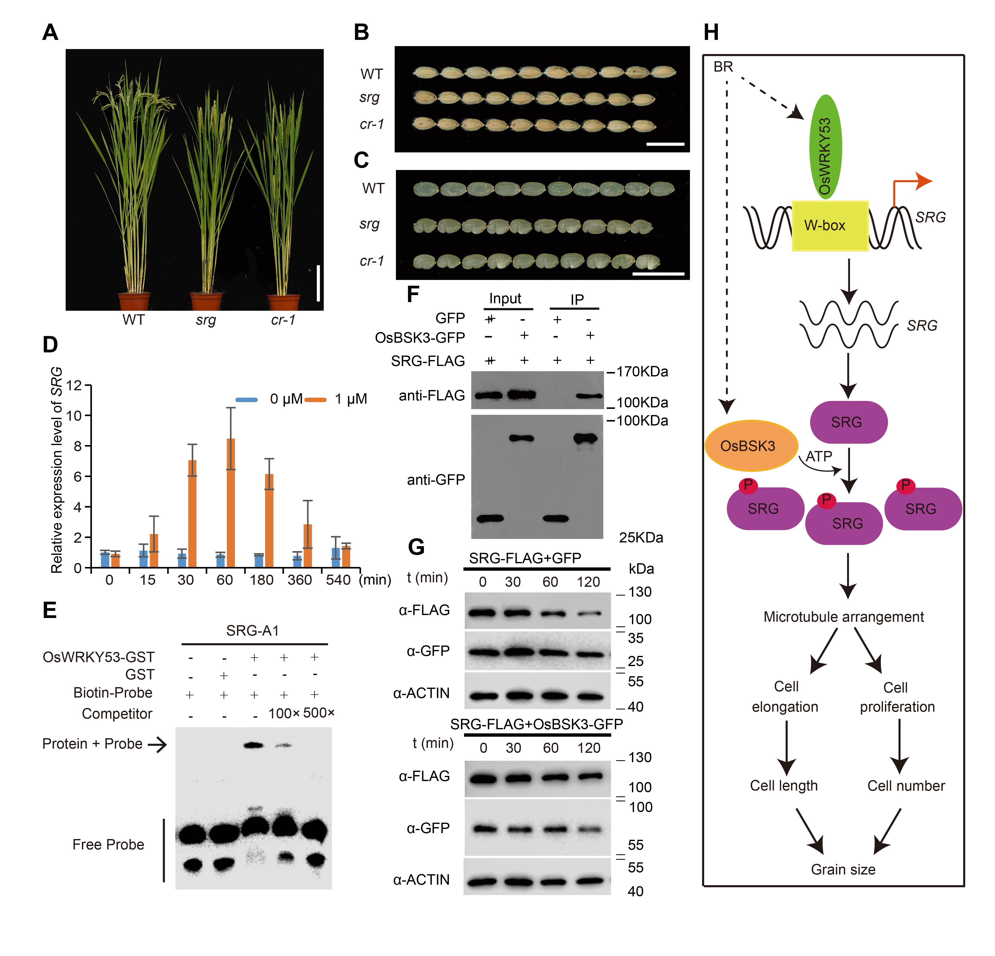 研究人员鉴定到一个半矮秆小粒的水稻突变体srg,突变体株高变矮、粒长变短。图位克隆发现SRG编码一个含有kinesin结构域蛋白。细胞学分析发现,srg突变体的穗表皮细胞长度和数目减少,表明SRG通过影响细胞大小和细胞增殖来调控粒型。定量结果显示SRG在植物的各组织中组成性表达,在幼穗中表达相对较高。SRG受BR诱导,OsWRKY53激活SRG基因的表达,OsBSK3与SRG蛋白互作,进而磷酸化SRG蛋白,SRG蛋白变得更稳定。此外,免疫荧光实验发现突变体srg和敲除突变体cr-1的微管(MT)形态异常。这些发现表明,BR可能通过稳定SRG蛋白来促进微管的有序组装和排列,从而调控籽粒大小。同时,SRG过表达产生更大的籽粒,并且增加了千粒重,说明SRG具有提高水稻产量的潜力。我们的研究表明,SRG是一种新的BR响应因子,BR可能通过影响SRG的表达来调控水稻粒型。