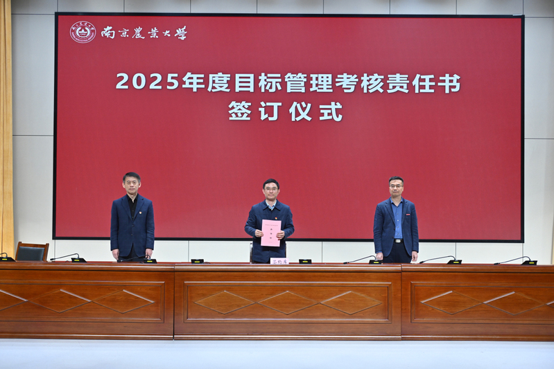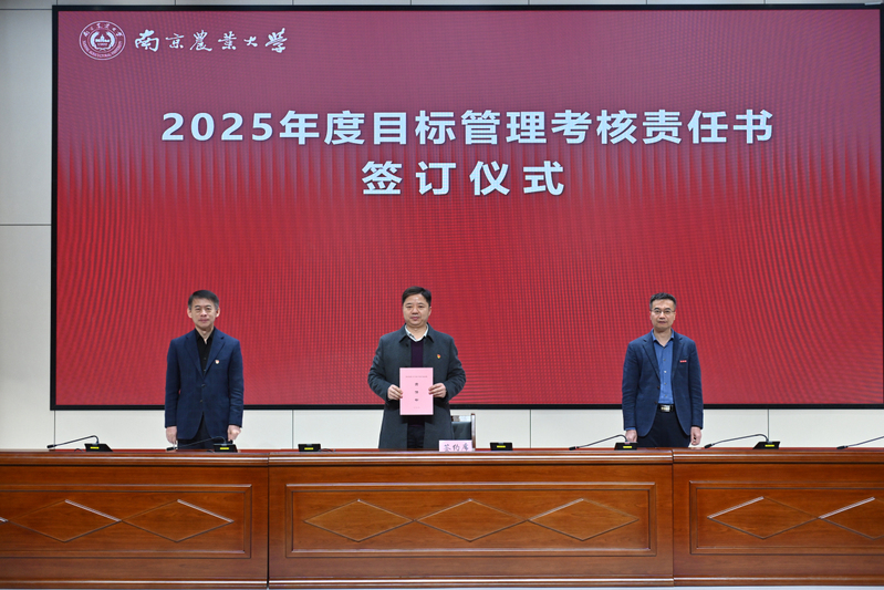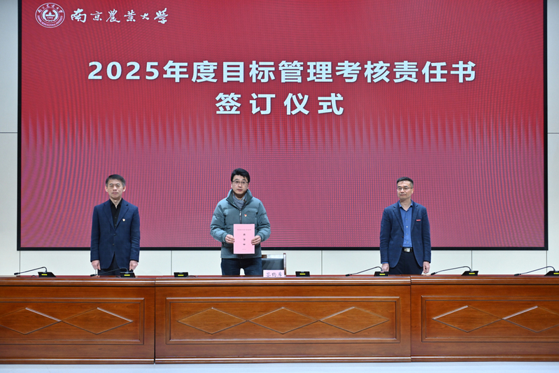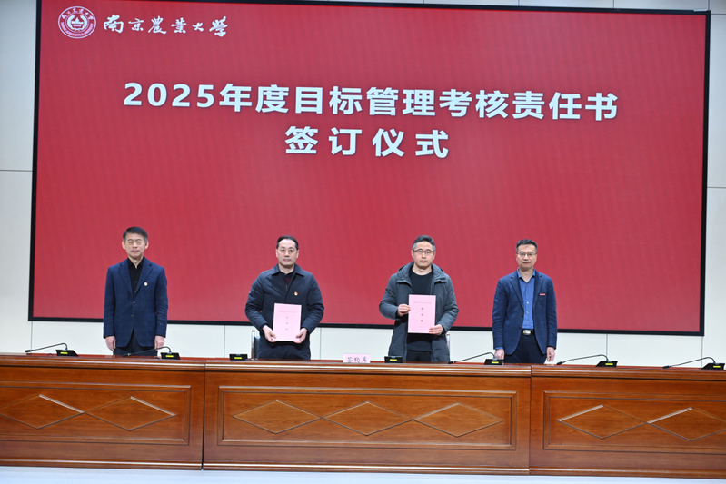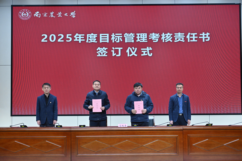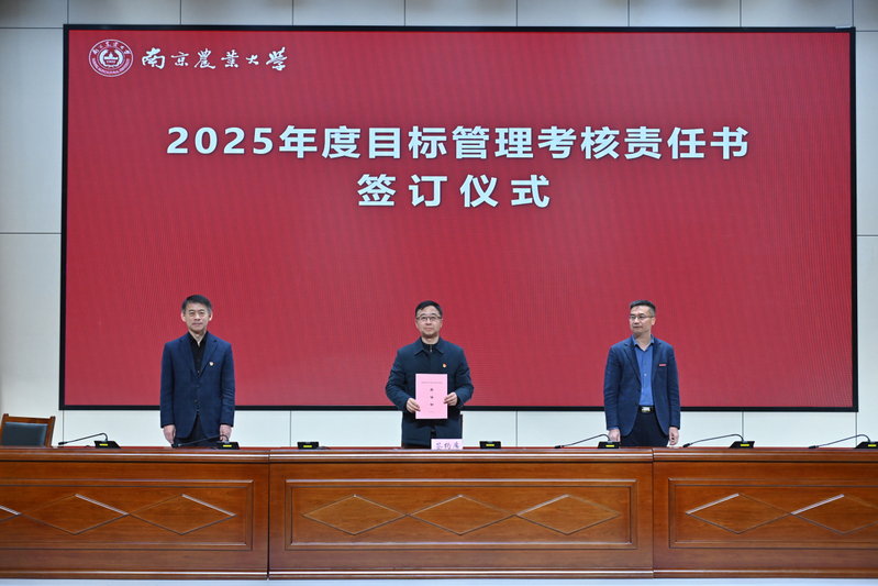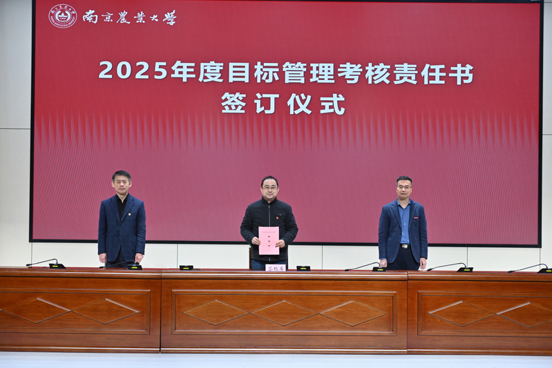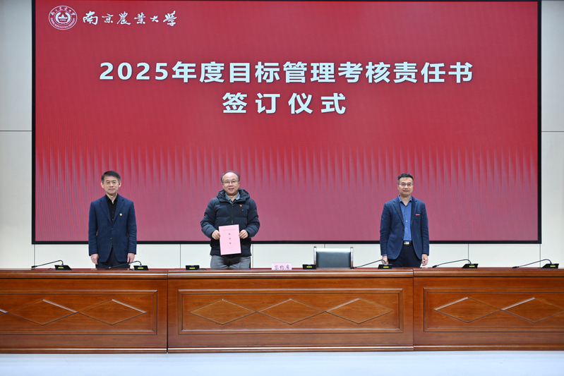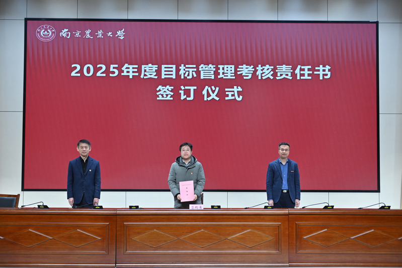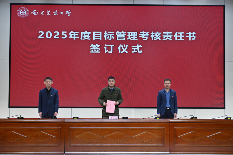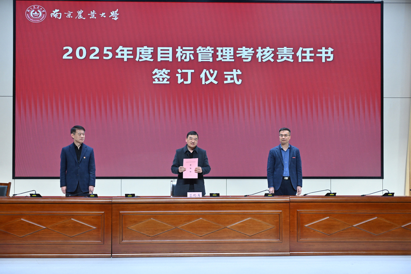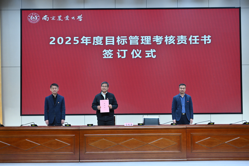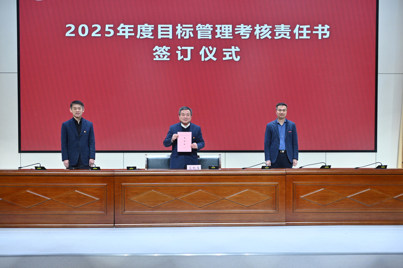 会上举行了2025年度全校目标管理考核责任书签订仪式,全体校领导、各学院各单位主要领导依次签订责任书。