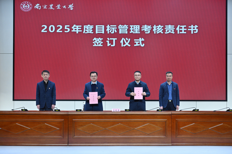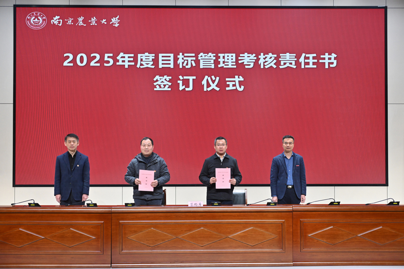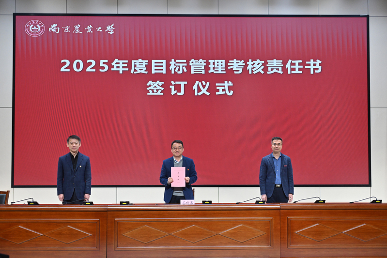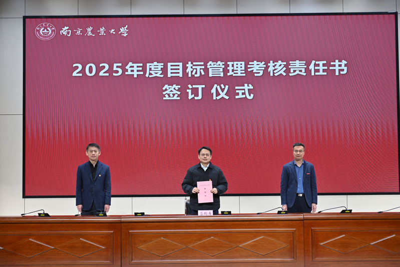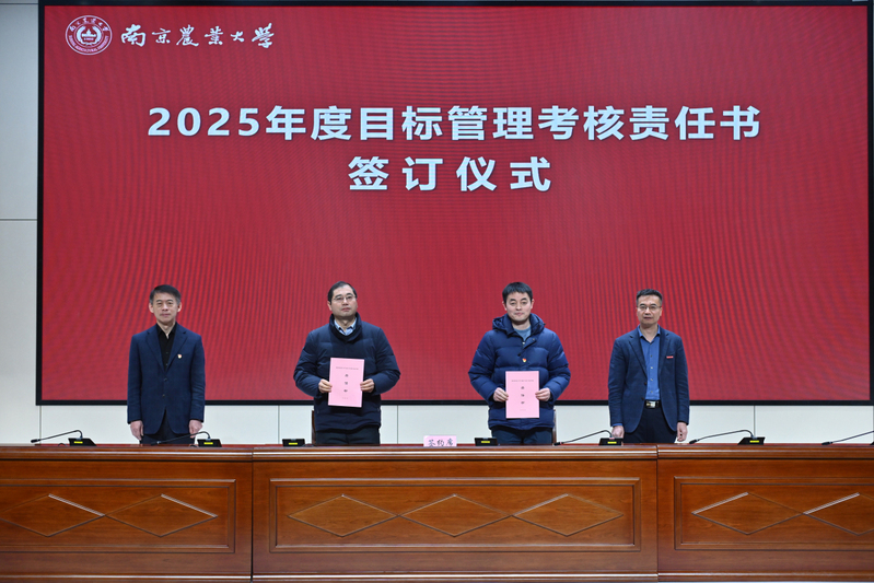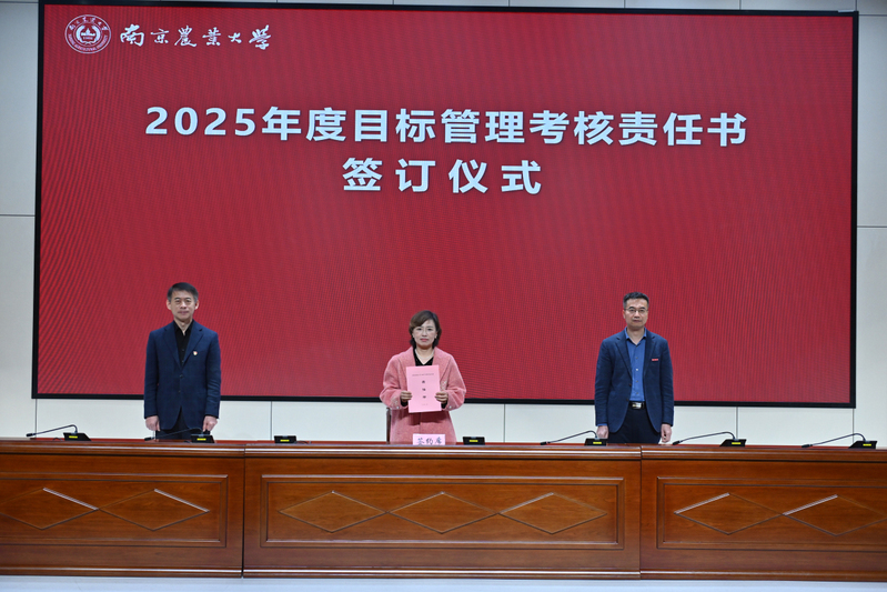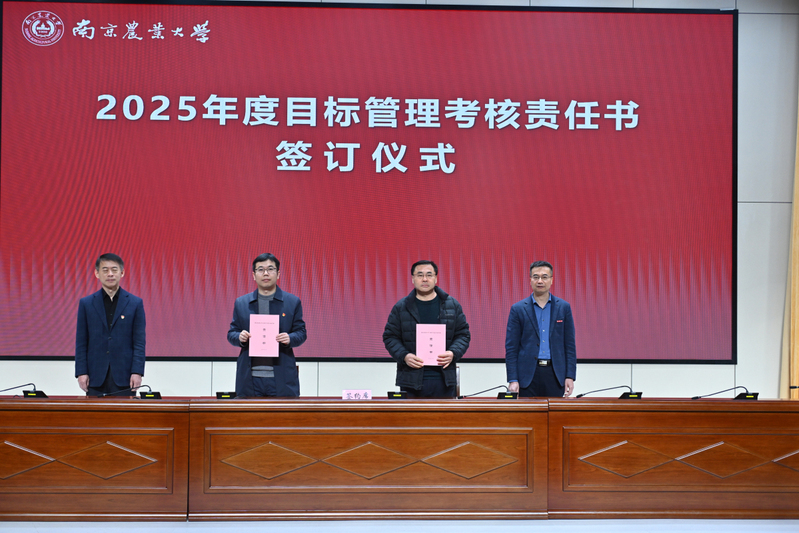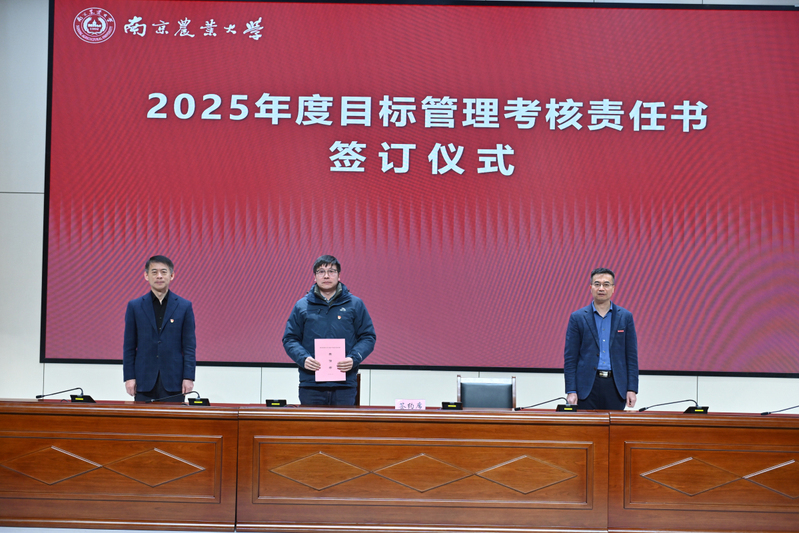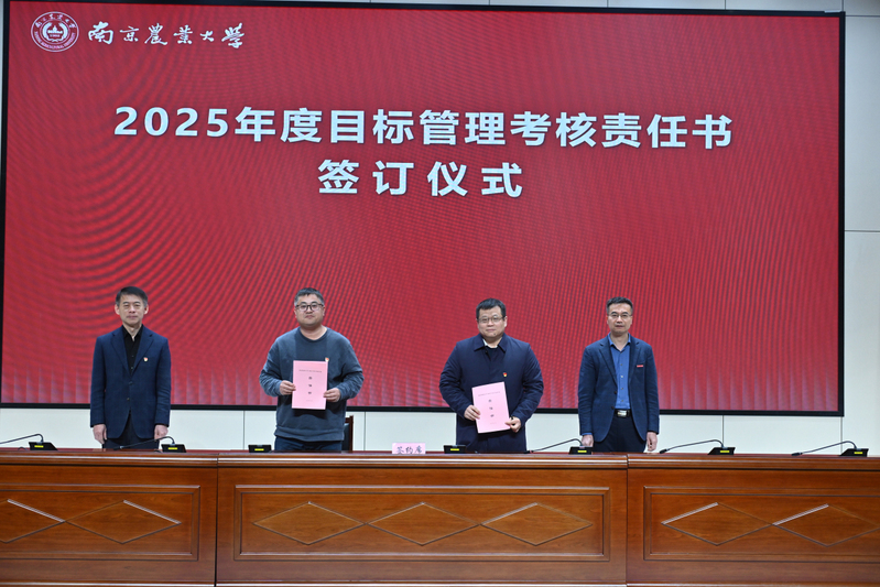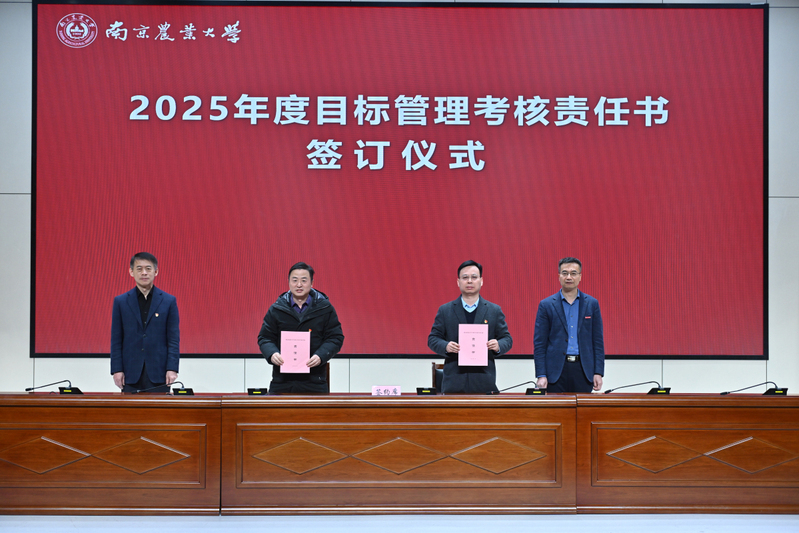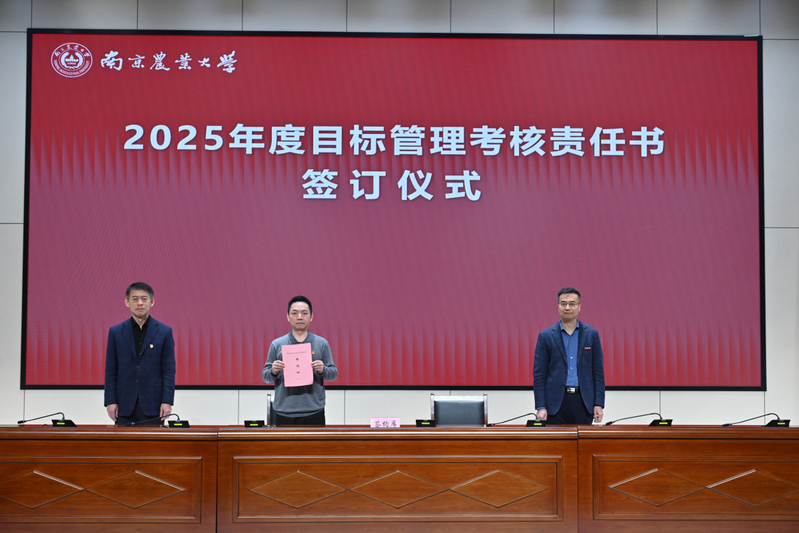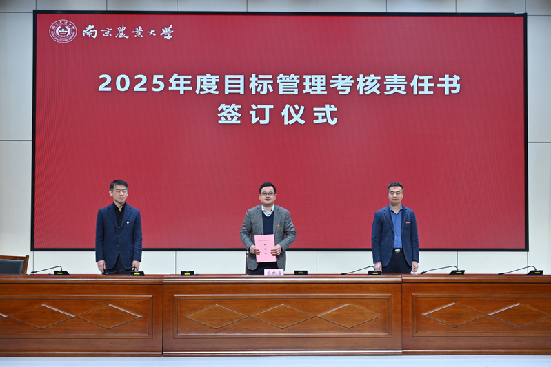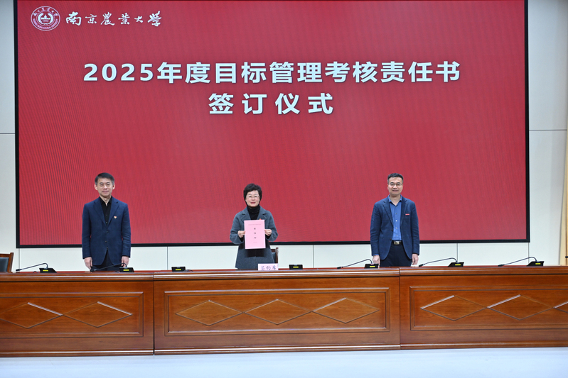 会上举行了2025年度全校目标管理考核责任书签订仪式,全体校领导、各学院各单位主要领导依次签订责任书。