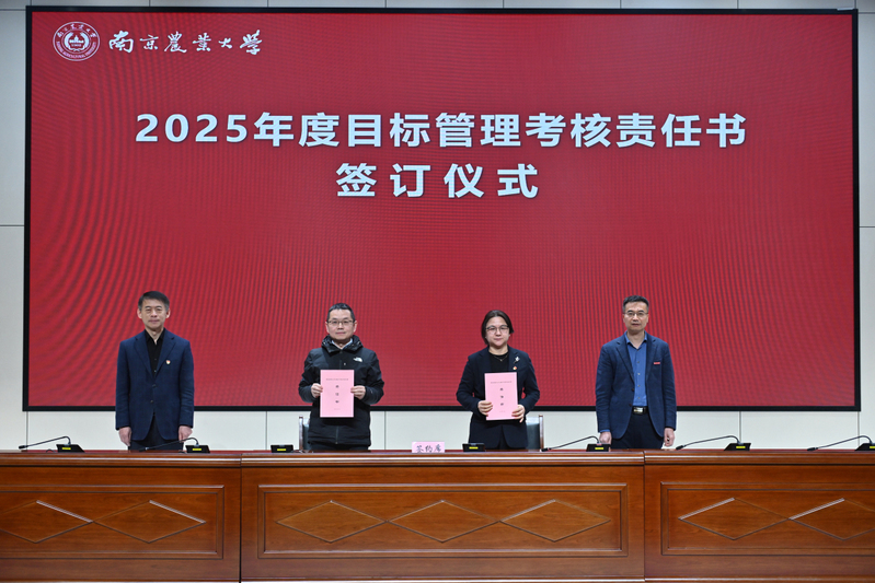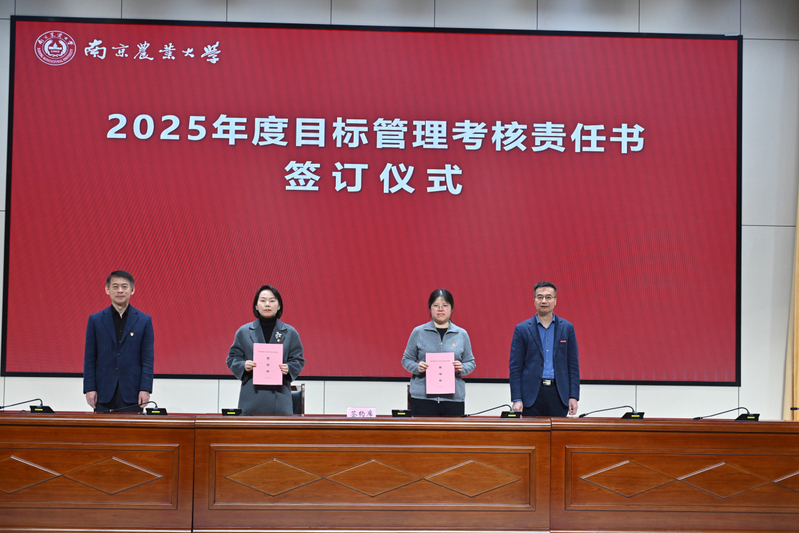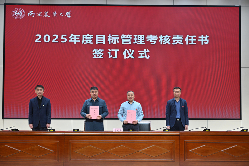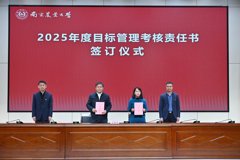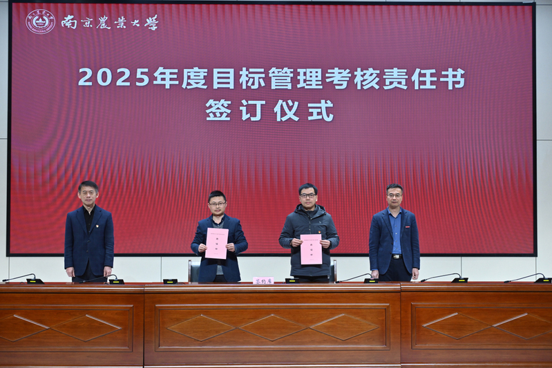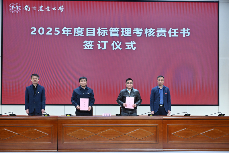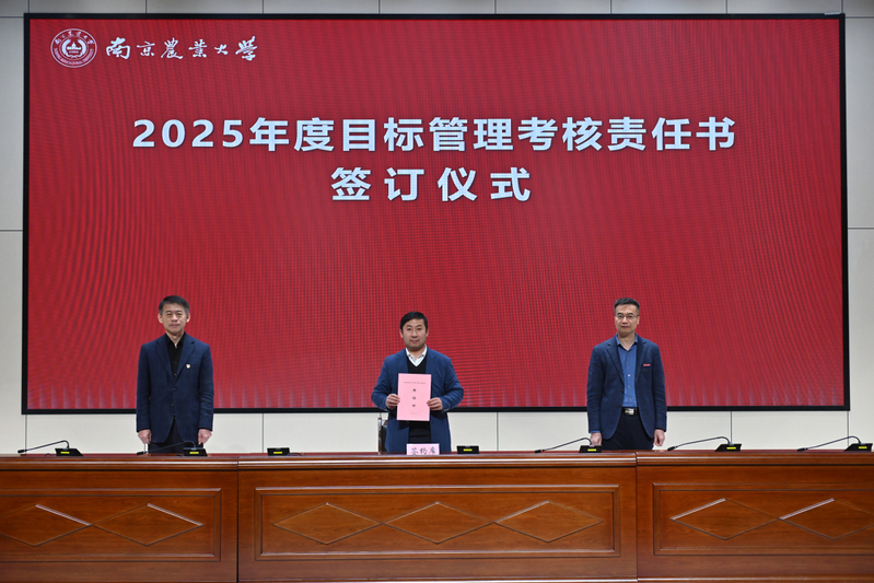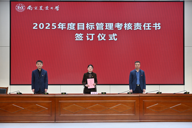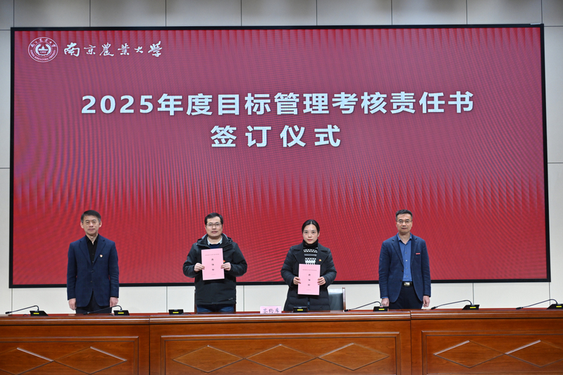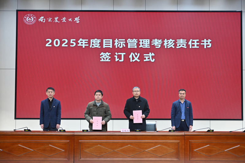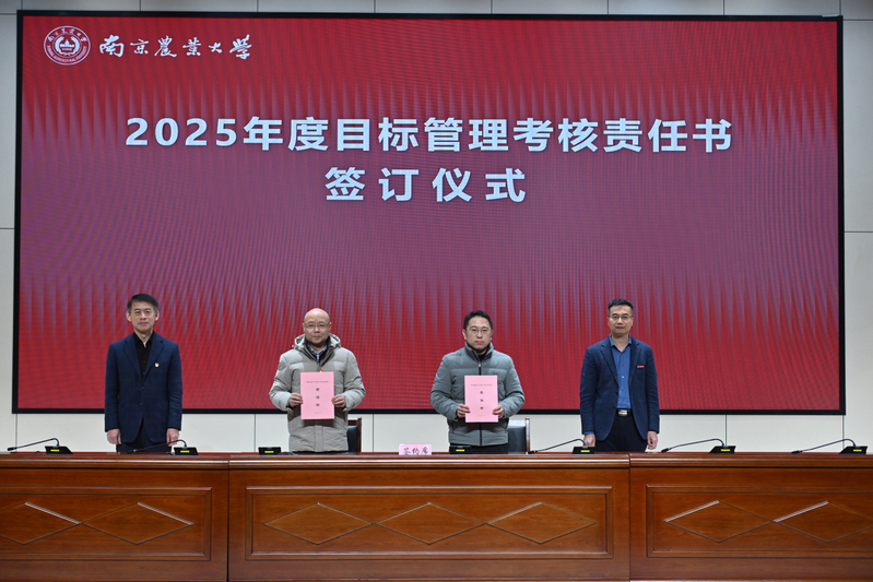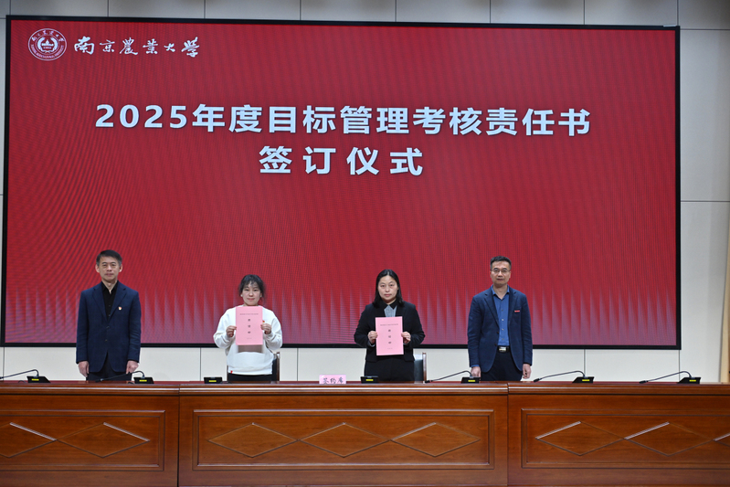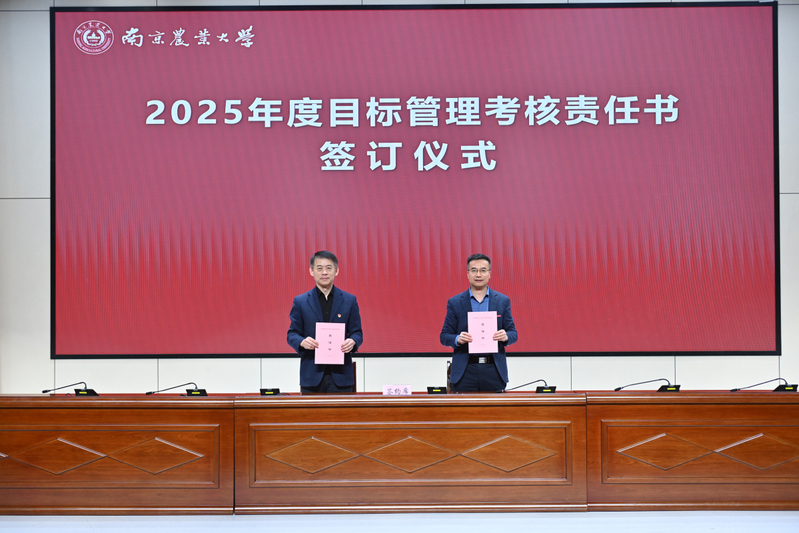 会上举行了2025年度全校目标管理考核责任书签订仪式,全体校领导、各学院各单位主要领导依次签订责任书。