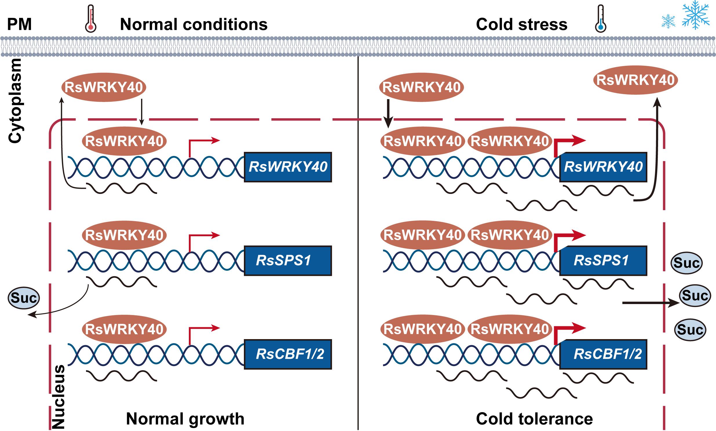 该研究解析了RsWRKY40参与应答低温胁迫的分子调控网络,低温快速诱导RsWRKY40表达后,RsWRKY40结合到RsSPS1和RsCBF1/2的启动子上并激活其表达,协调蔗糖合成和CBF信号通路,进而调控萝卜耐冷性(图4)。研究结果为解析萝卜低温胁迫响应机制,以及耐冷性的分子育种提供了宝贵的基因资源和理论依据。