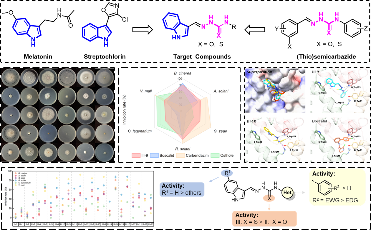 研究团队从褪黑素结构出发,分别引入脲、氨基脲、氨基硫脲片段并测试抗菌活性,发现含有氨基硫脲结构的褪黑素衍生物表现出显著的抗菌活性。其中化合物Ⅲ-9对测试的六种植物致病真菌表现出广谱的抑制活性,相较于褪黑素的抗菌活性提高了10倍以上,Ⅲ-9对水稻纹枯病菌的抑制率达到87.2%,活体抗菌活性结果表明,Ⅲ-9对黄瓜灰霉病菌、油菜菌核病菌和辣椒疫霉病菌有接近50%的抑制效果。此外,构效分析发现吲哚5号位取代基的存在,无论是推电子基还是吸电子基,均会使活性较低。