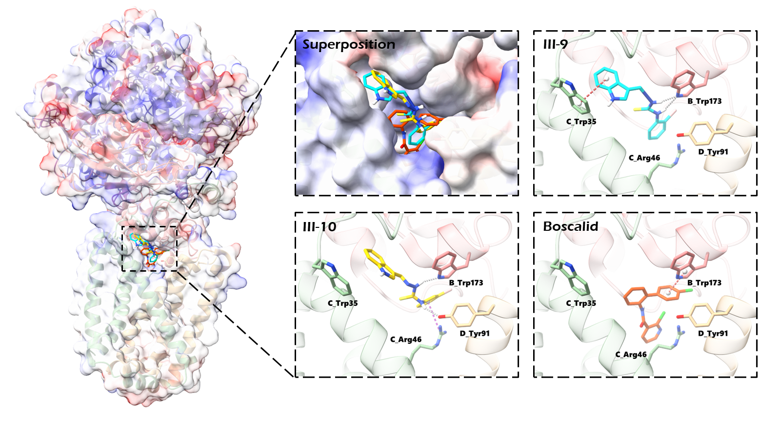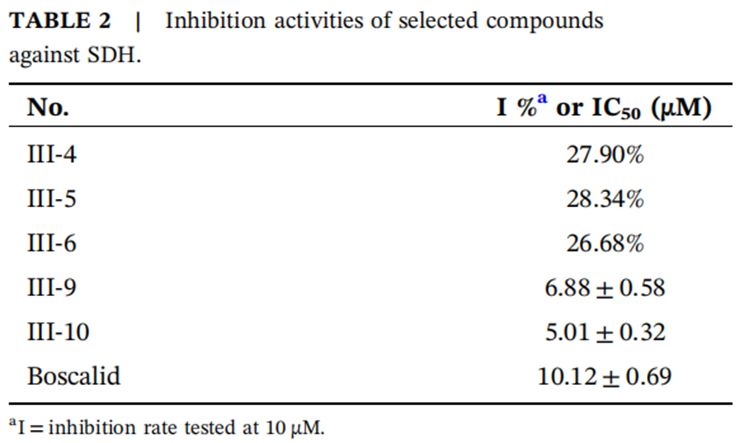在此基础上,团队还通过分子对接模拟和酶活实验对该系列化合物抗菌活性的作用机制进行了探索,比对筛选出琥珀酸脱氢酶(SDH)为对接靶标,结果表明Ⅲ-9,Ⅲ-10与SDH结合情况优于对照药啶酰菌胺的结合情况,与抗菌活性结果一致。SDH的酶抑制活性实验结果显示Ⅲ-9,Ⅲ-10优于商品化抑制剂啶酰菌胺,与虚拟分子对接结果和实验抗菌活性结果都保持了很好一致性,这些发现为SDH作为这一系列化合物的作用靶标提供了强有力的证据。研究团队还利用基于人工智能技术的在线预测平台对合成的化合物进行了类农药性预测,以指导后续的结构优化。